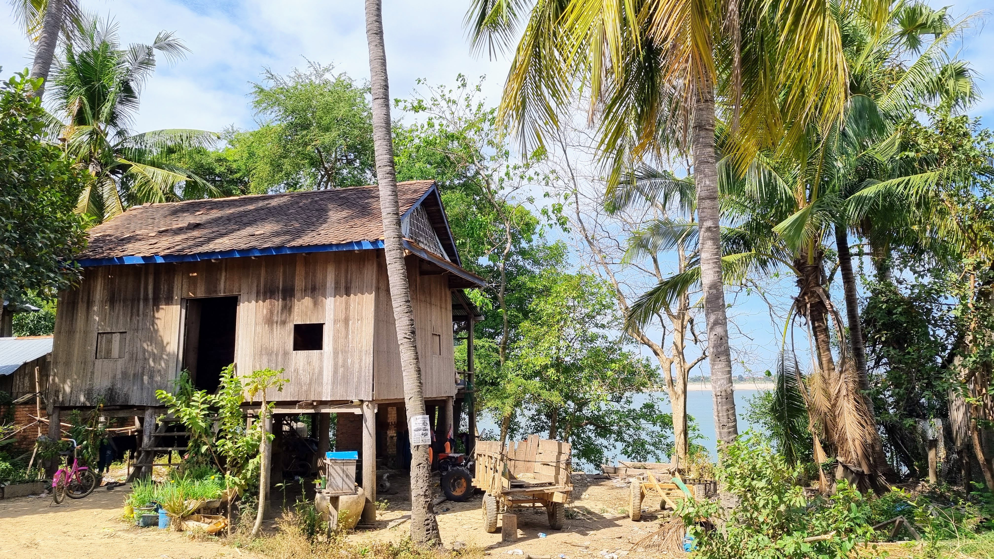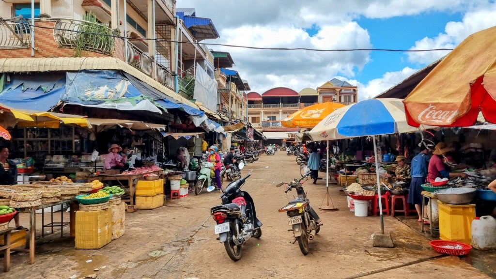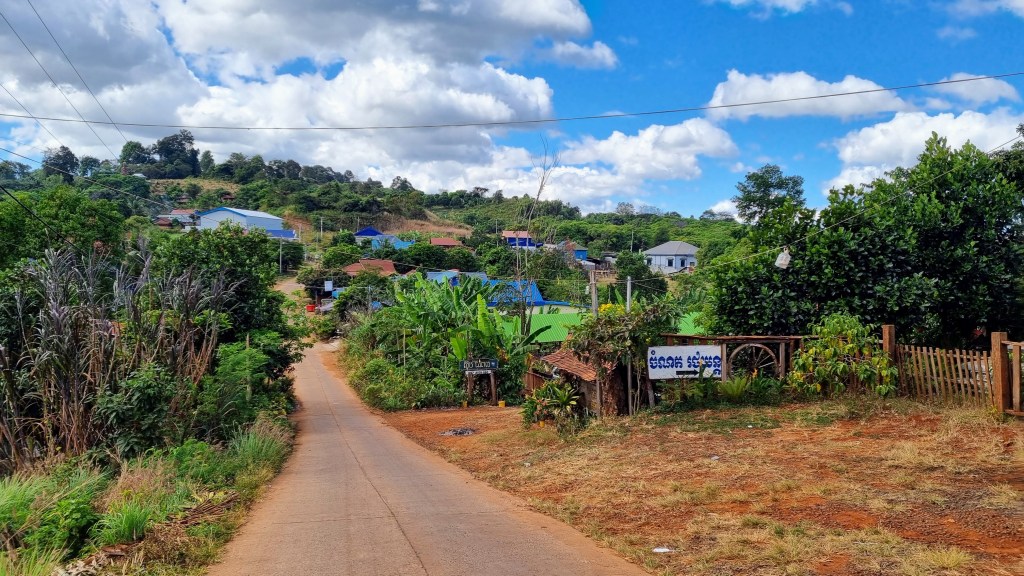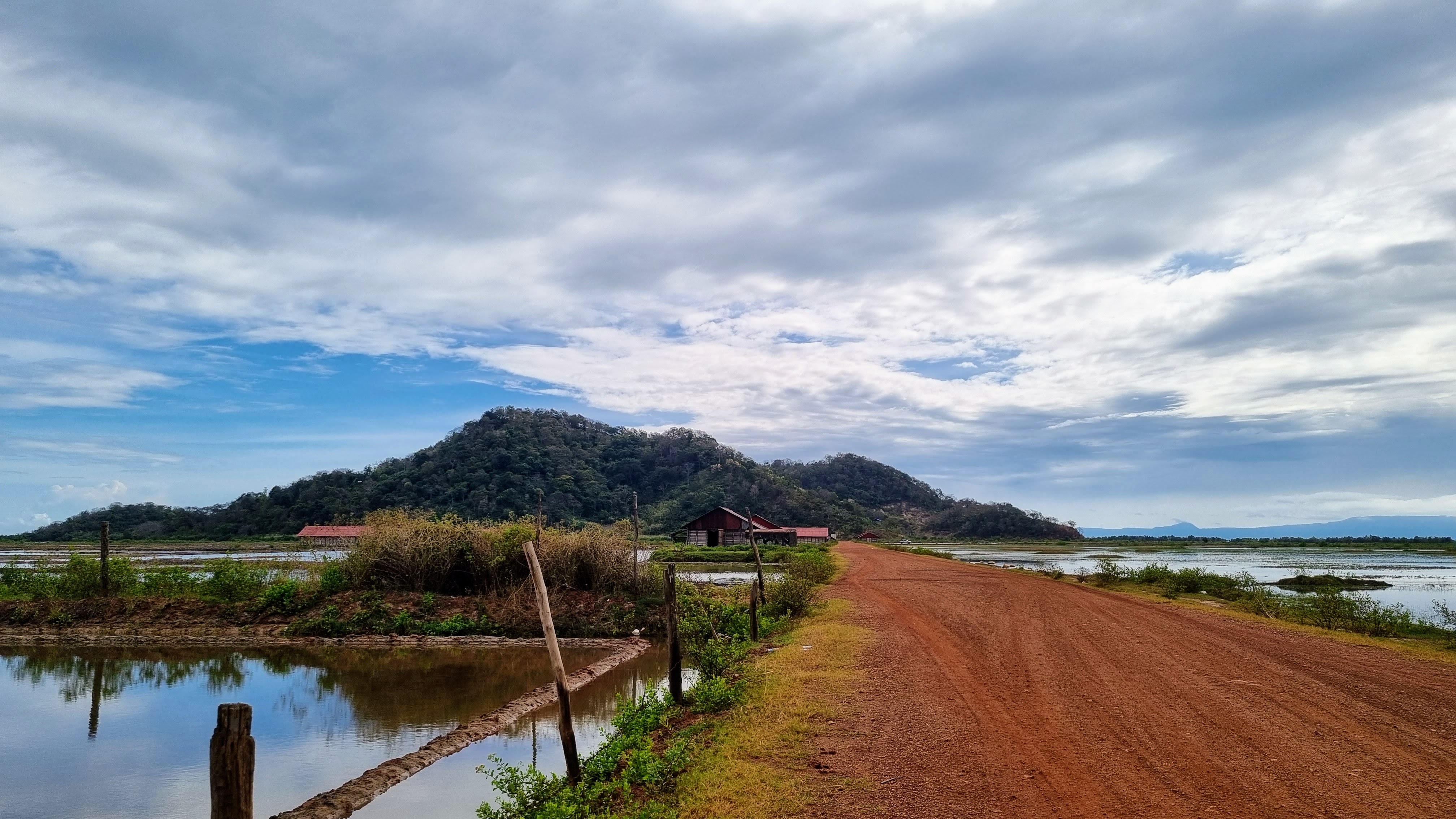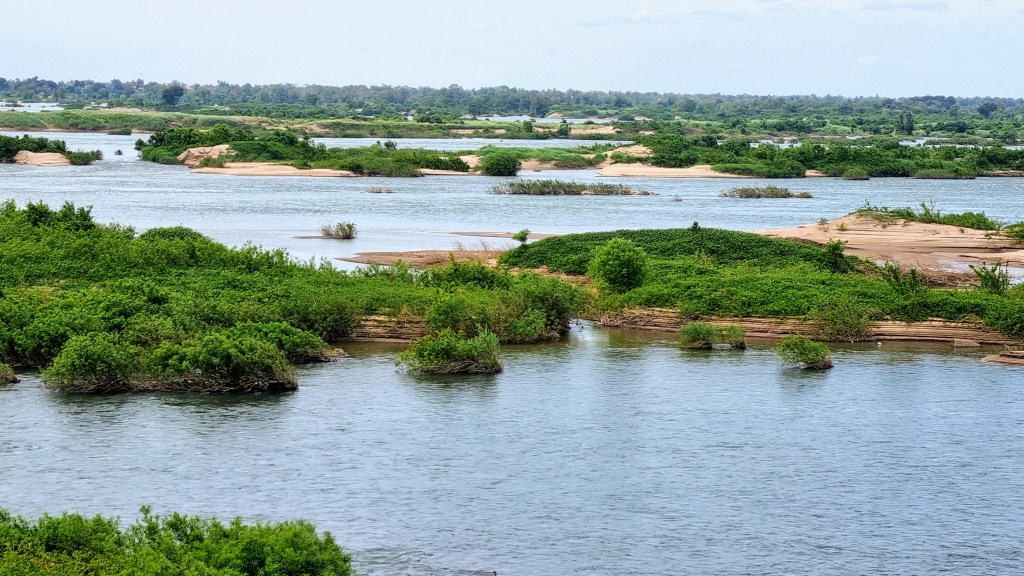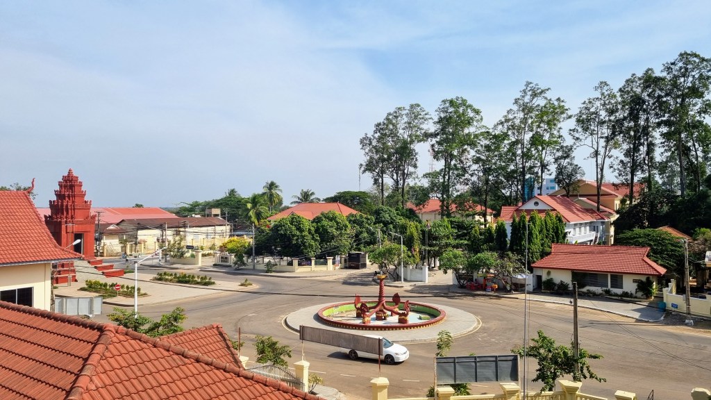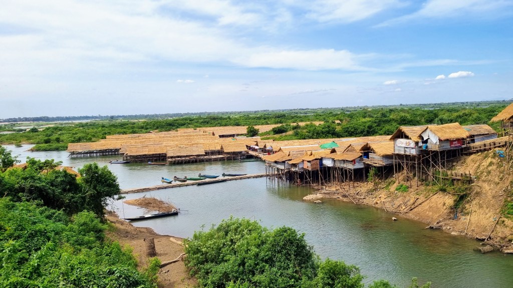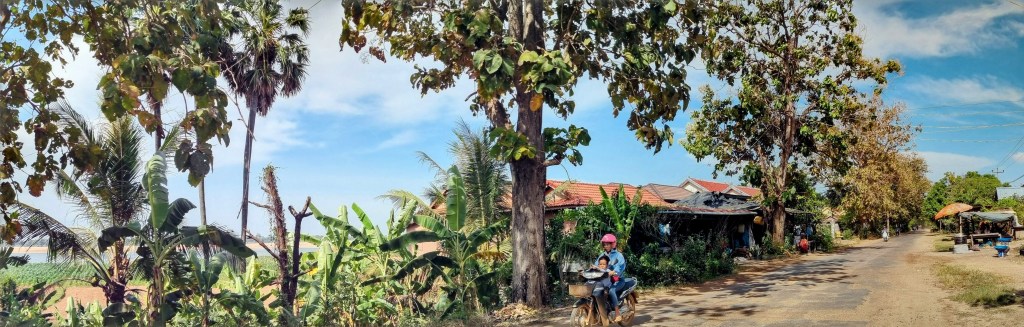 Bien que la ville soit petite, elle est le chef-lieu de la province du même nom. À peine sortis de la ville, nous traversons des hameaux et croisons des commerces en bord de route. On se retrouve rapidement sur des pistes poussiéreuses longeant des rizières d’un côté et le Mékong de l’autre.
