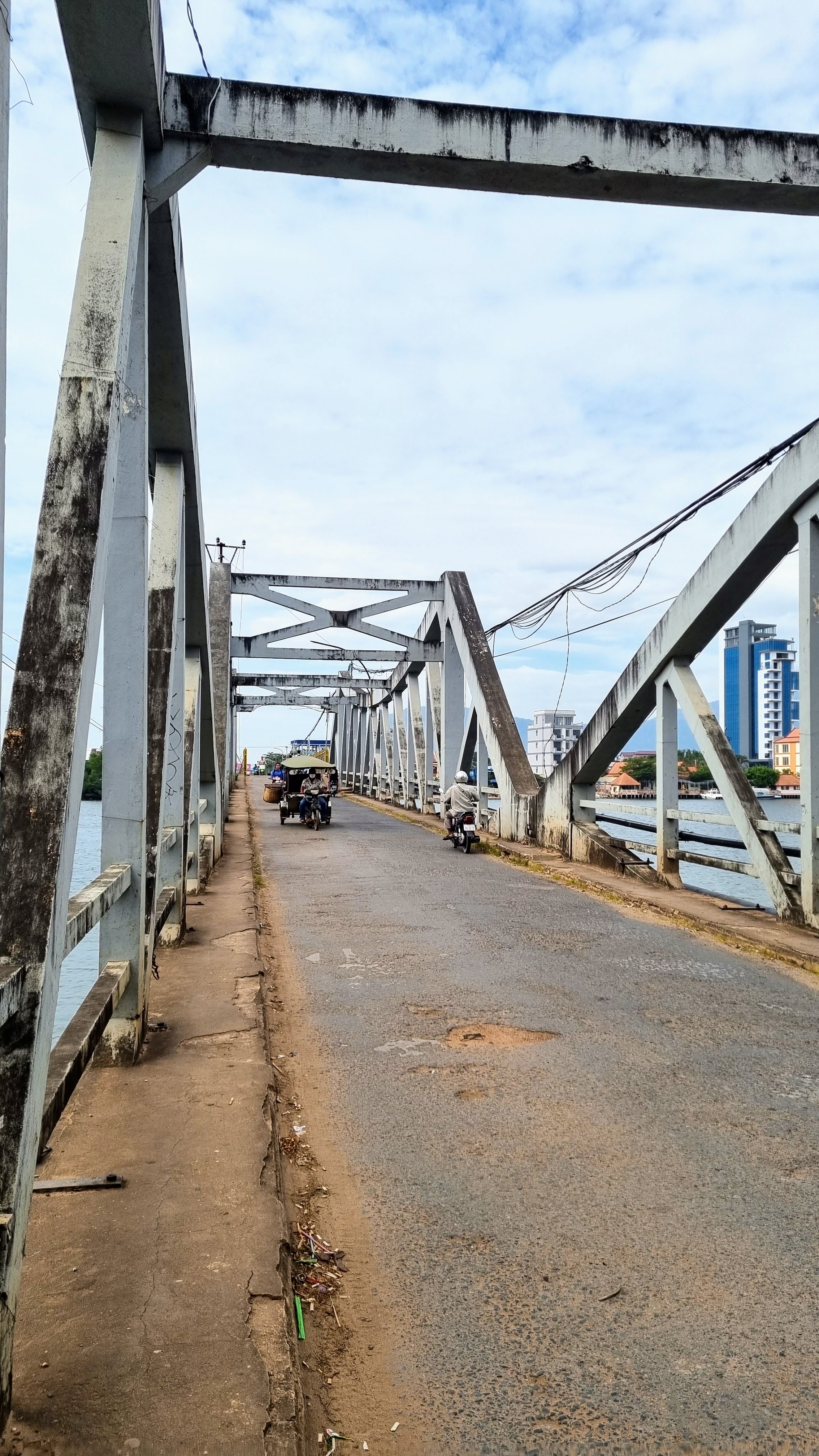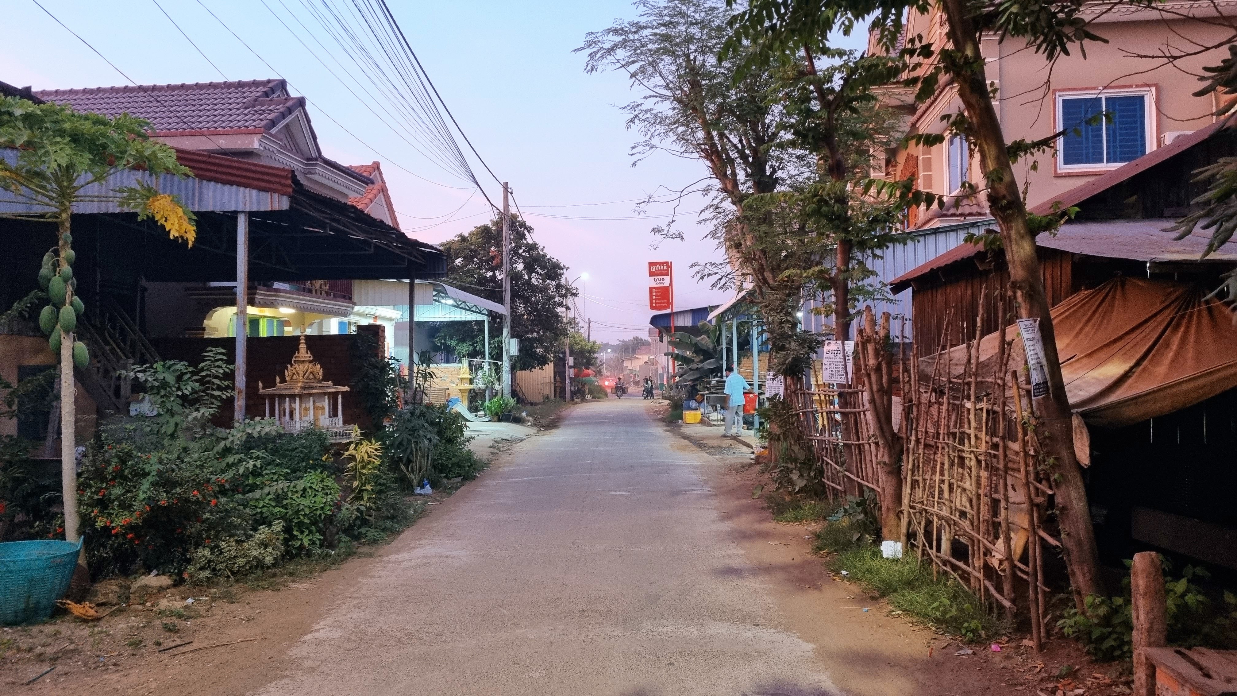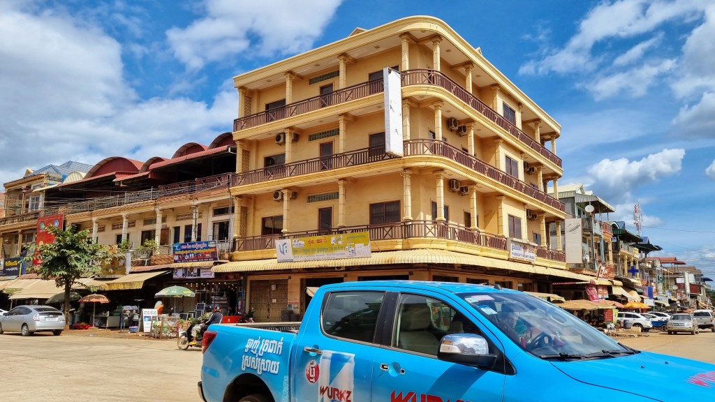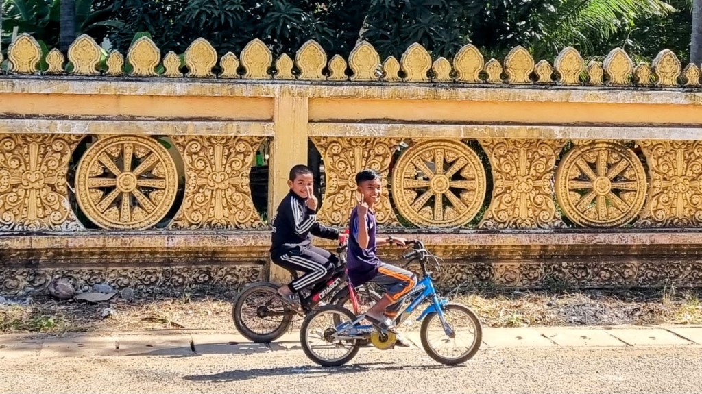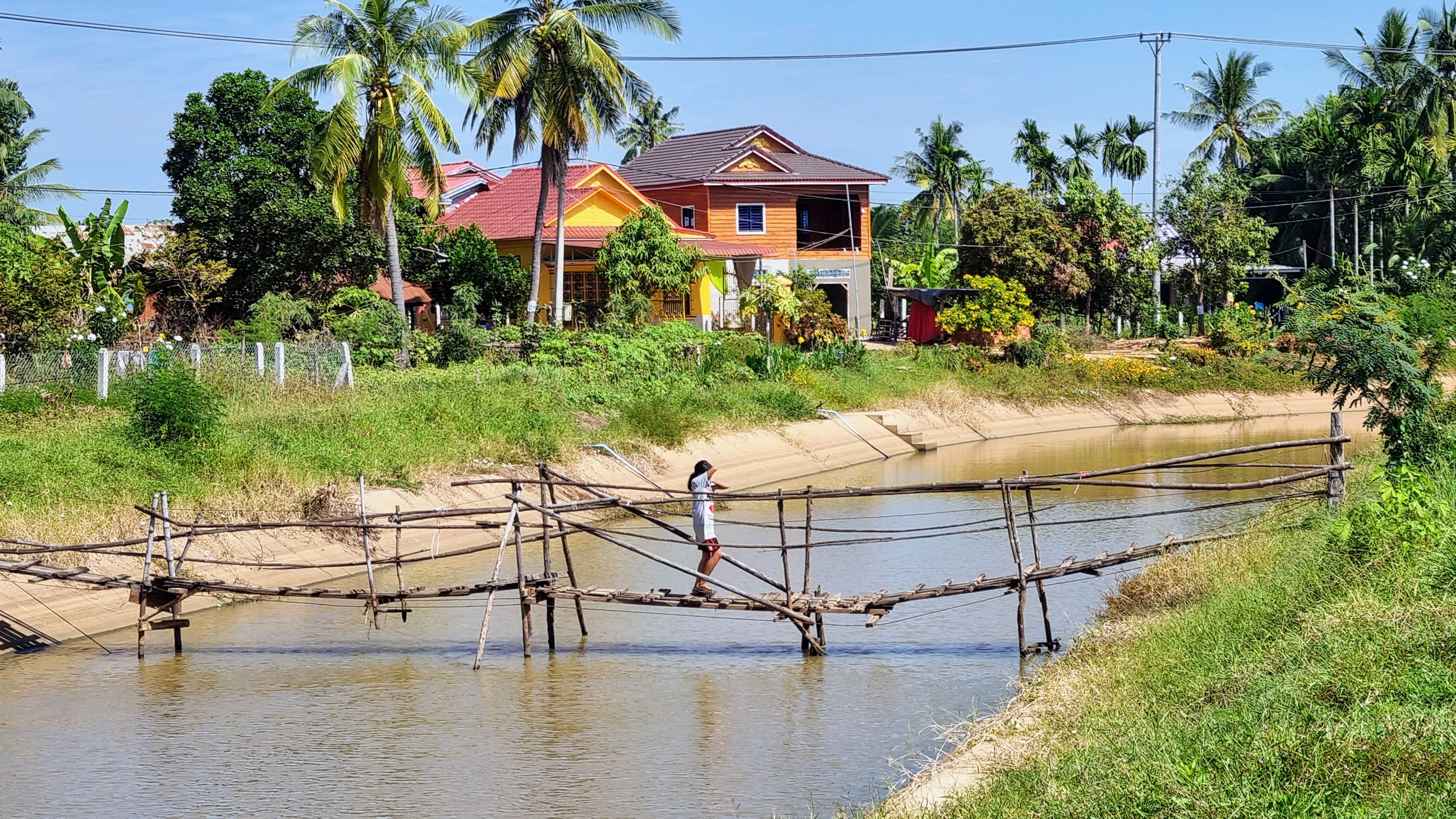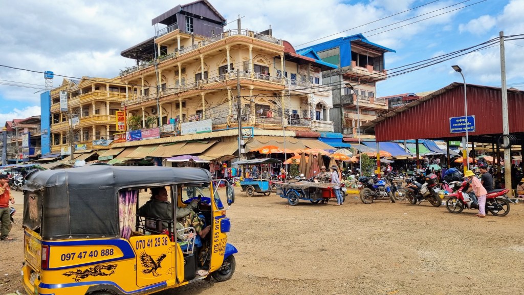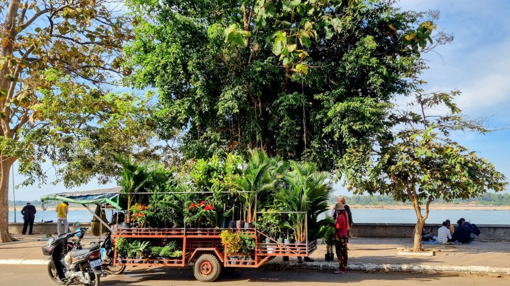 Bien que la ville soit petite, elle est le chef-lieu de la province du même nom. À peine sortis de la ville, nous traversons des hameaux et croisons des commerces en bord de route. On se retrouve rapidement sur des pistes poussiéreuses longeant des rizières d’un côté et le Mékong de l’autre.