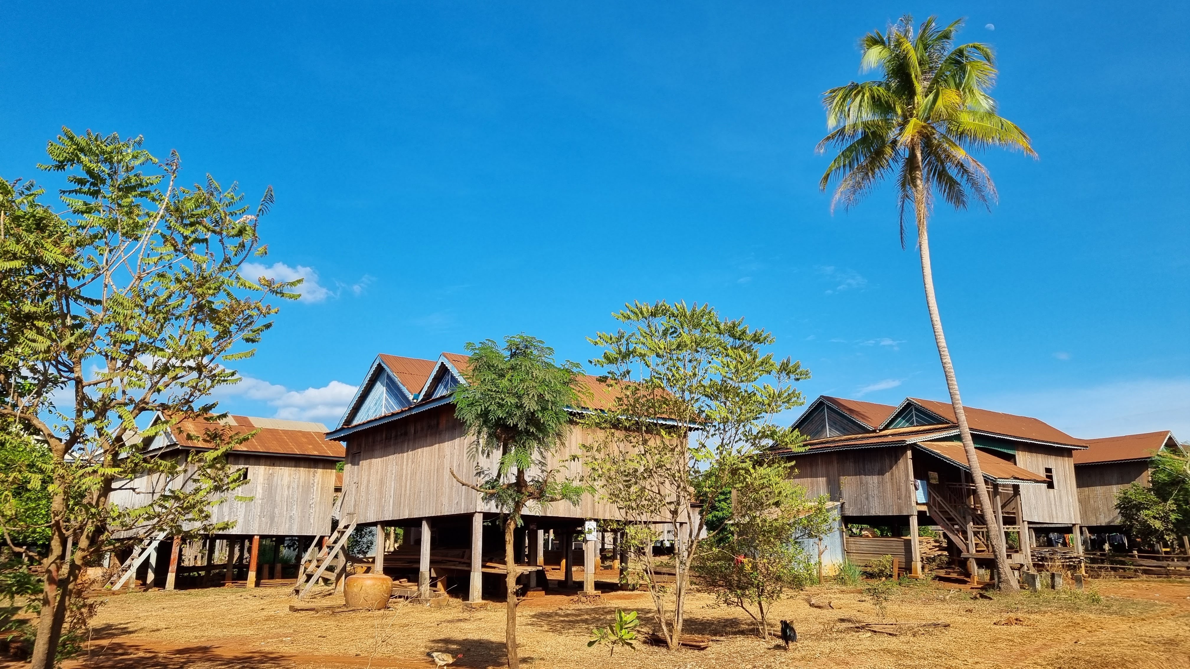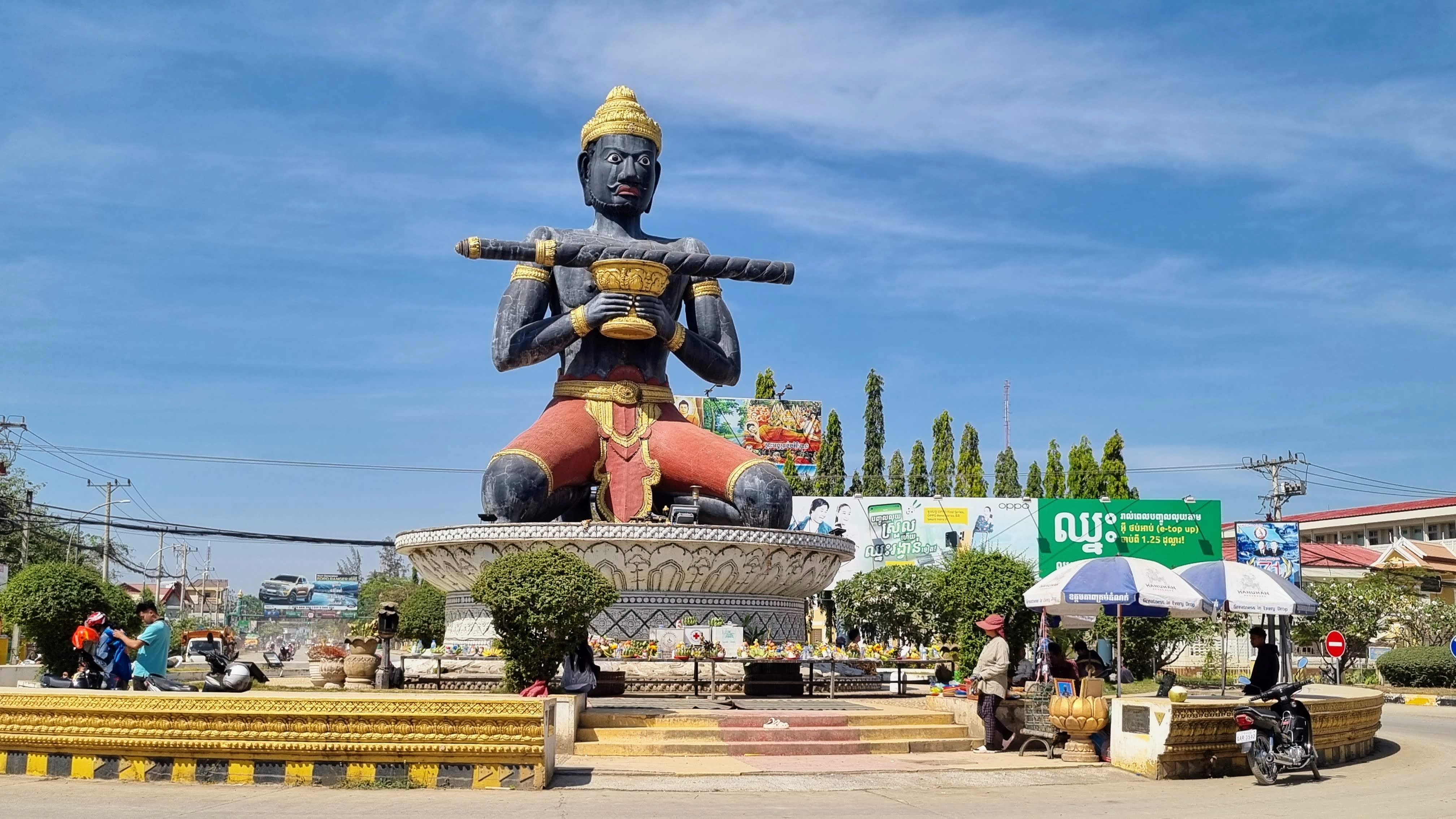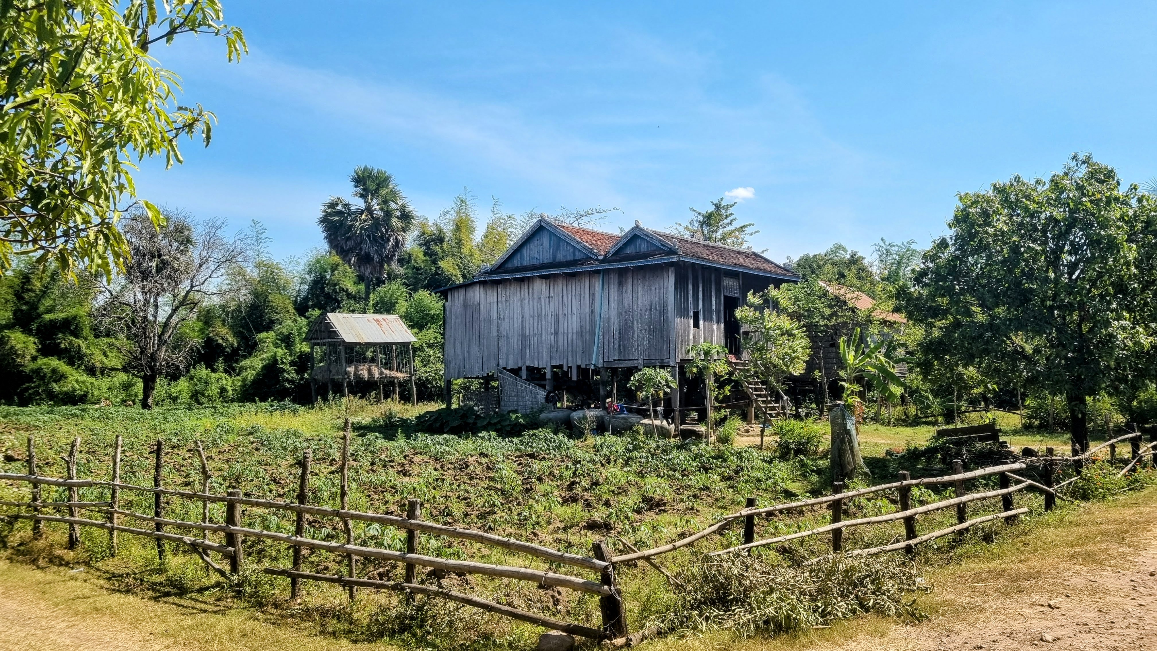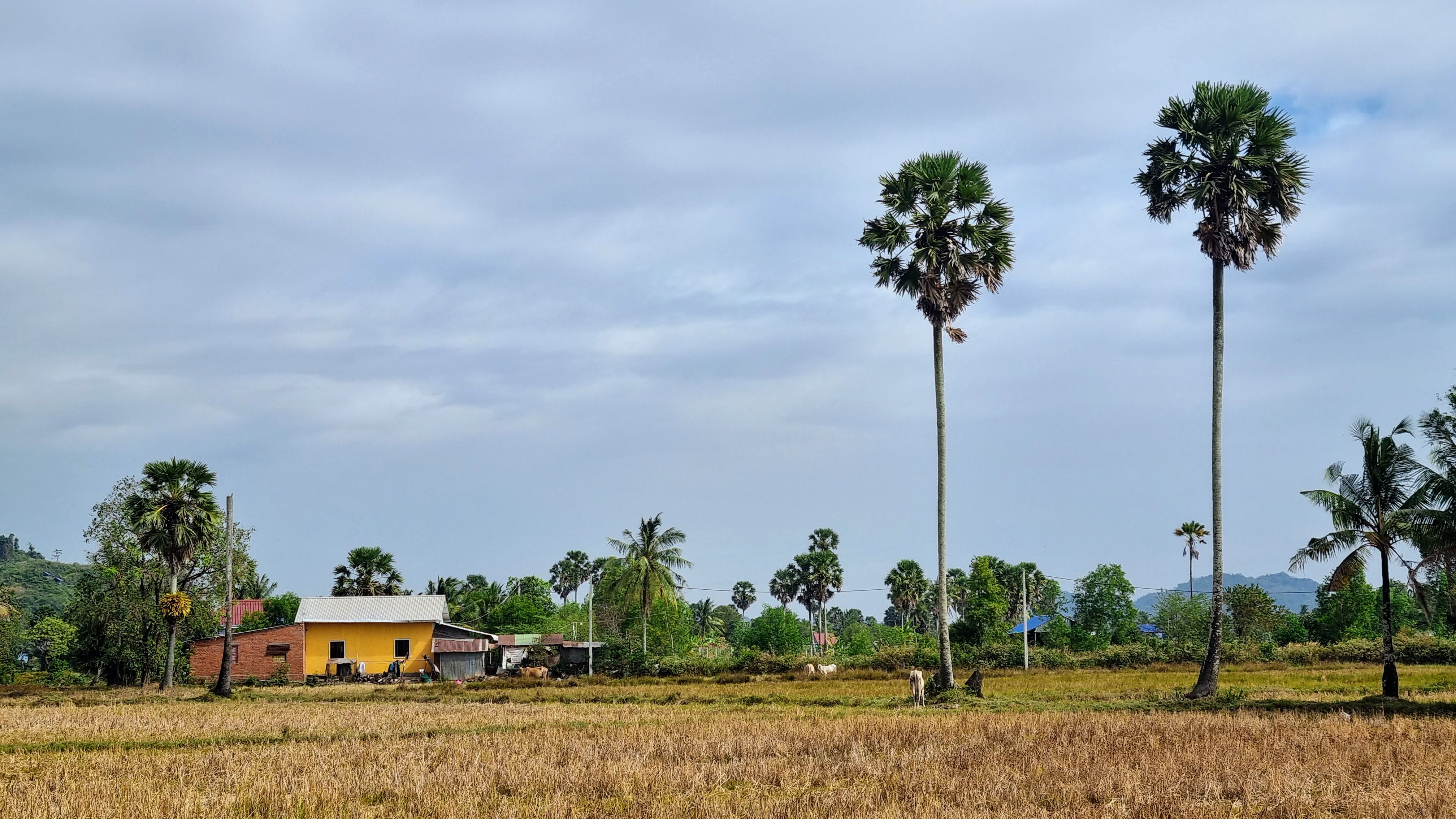 Bien que la ville soit petite, elle est le chef-lieu de la province du même nom. À peine sortis de la ville, nous traversons des hameaux et croisons des commerces en bord de route. On se retrouve rapidement sur des pistes poussiéreuses longeant des rizières d’un côté et le Mékong de l’autre.