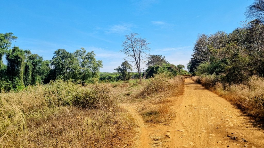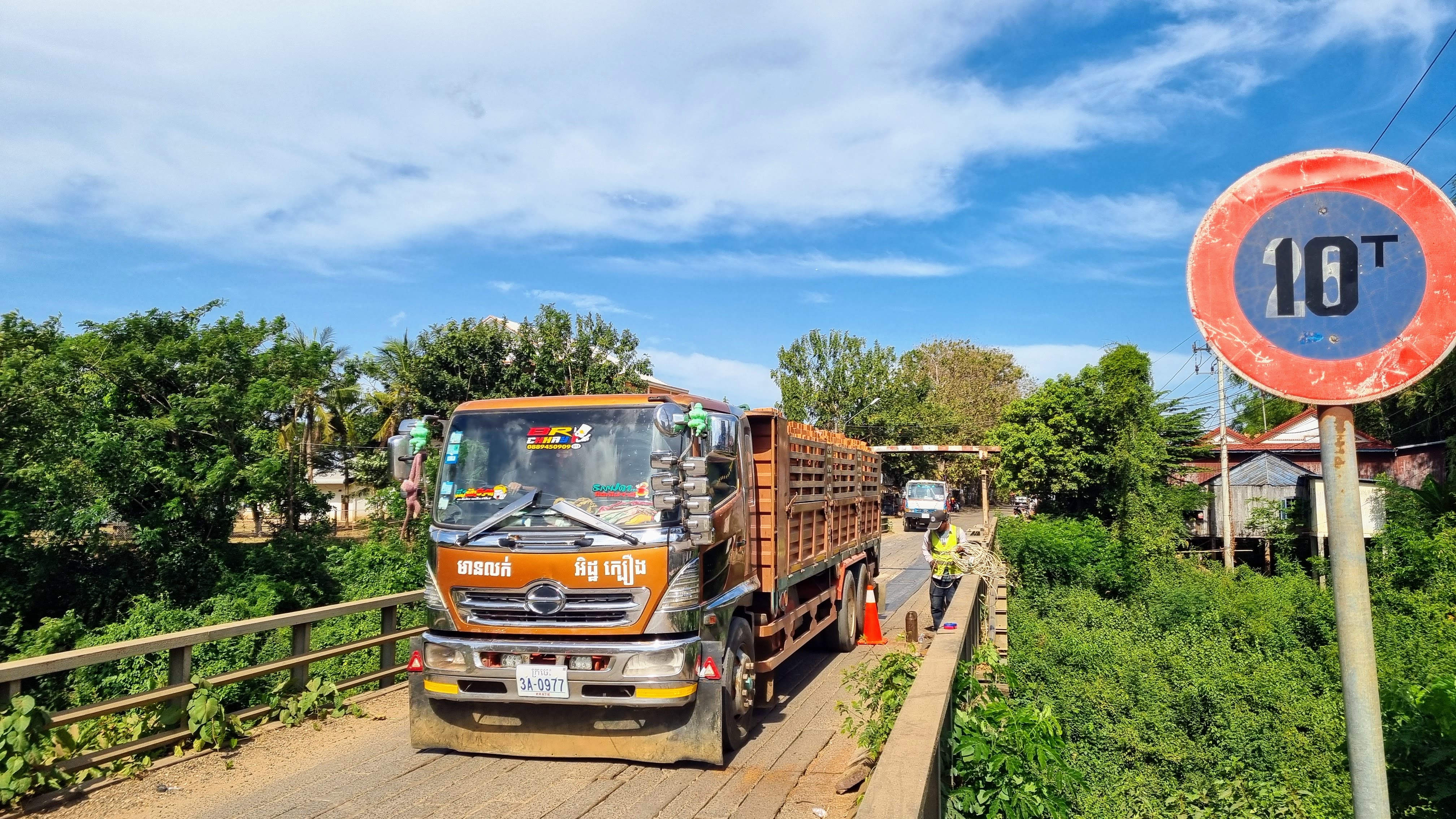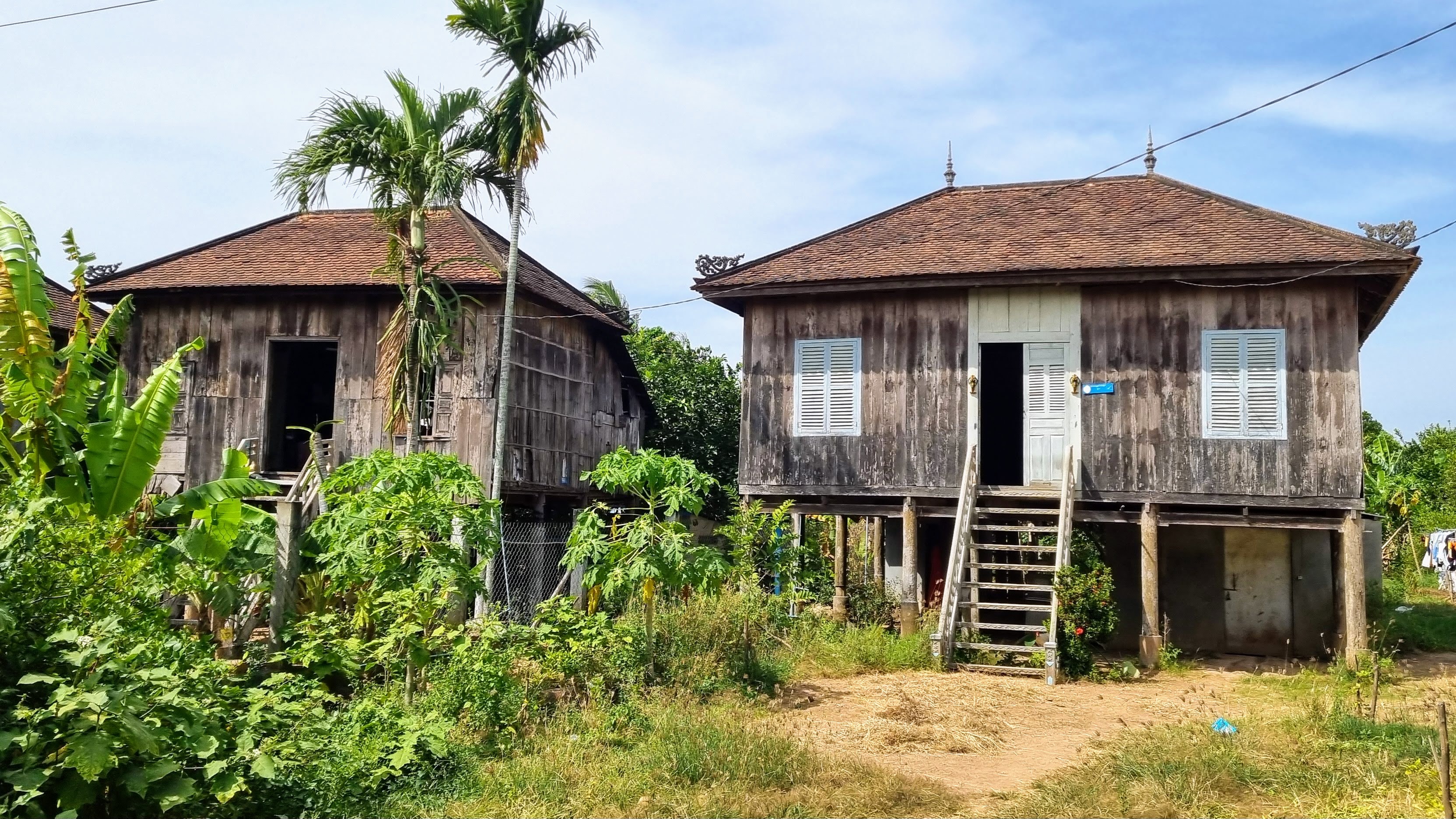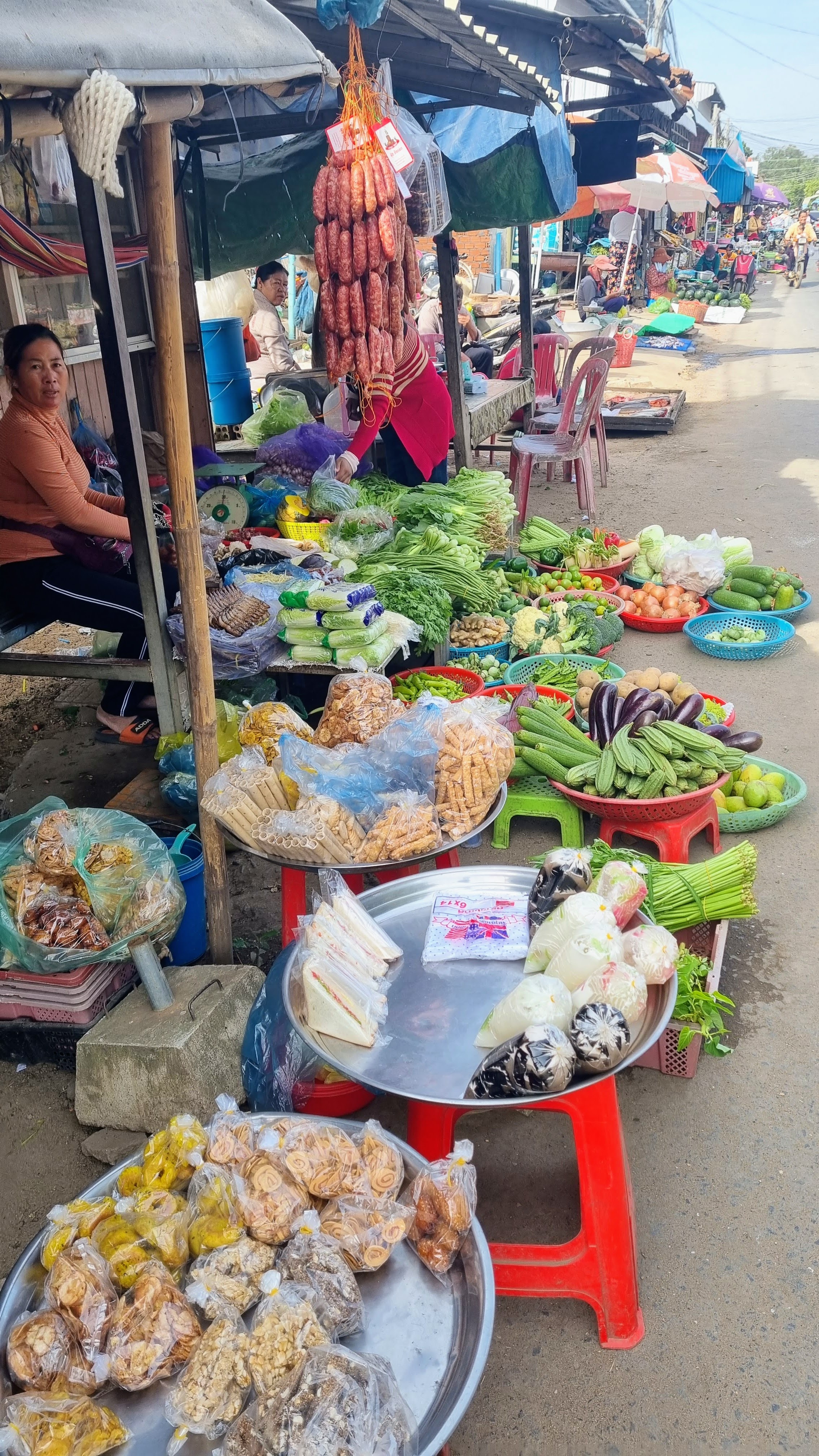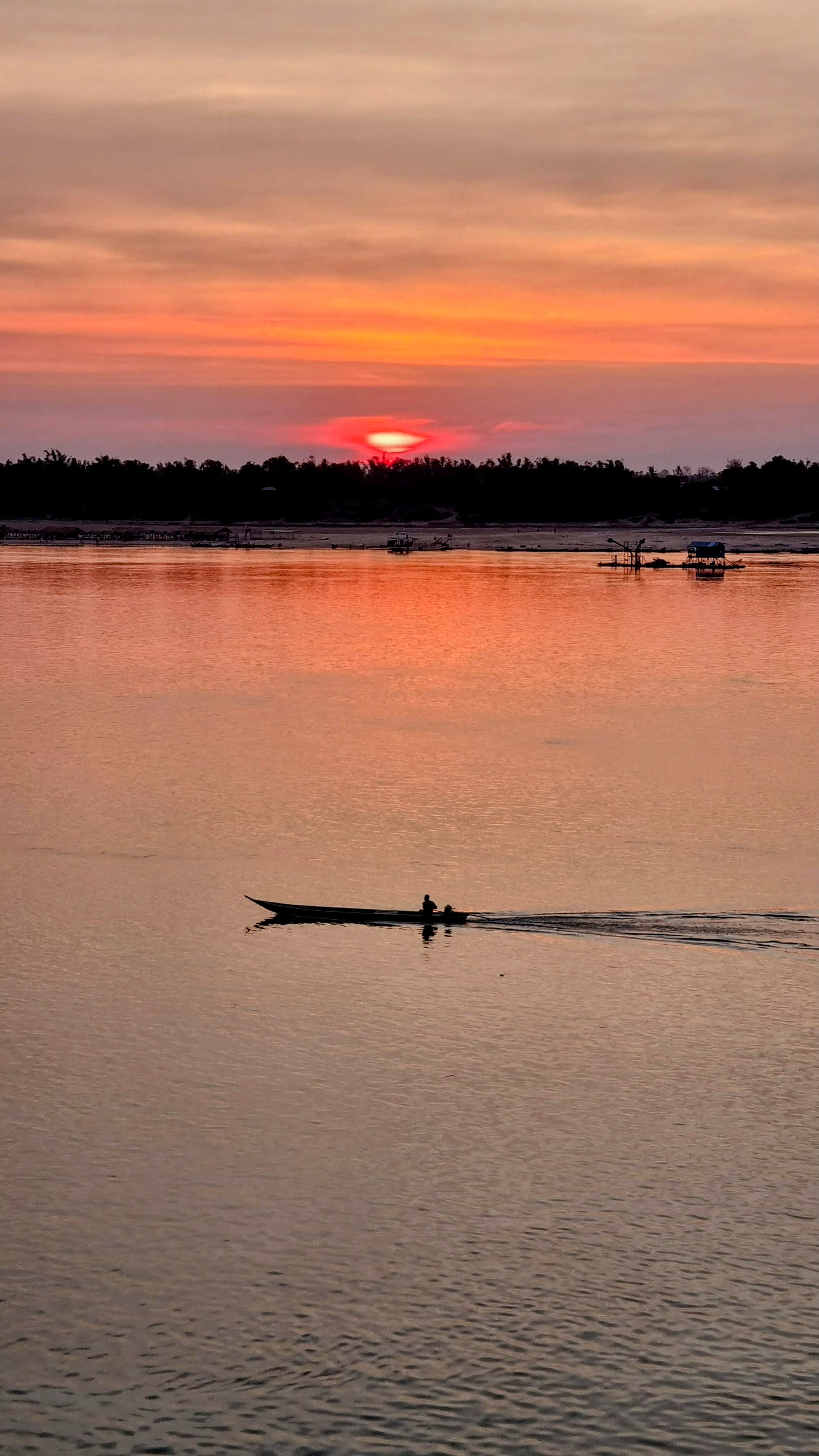 Bien que la ville soit petite, elle est le chef-lieu de la province du même nom. À peine sortis de la ville, nous traversons des hameaux et croisons des commerces en bord de route. On se retrouve rapidement sur des pistes poussiéreuses longeant des rizières d’un côté et le Mékong de l’autre.