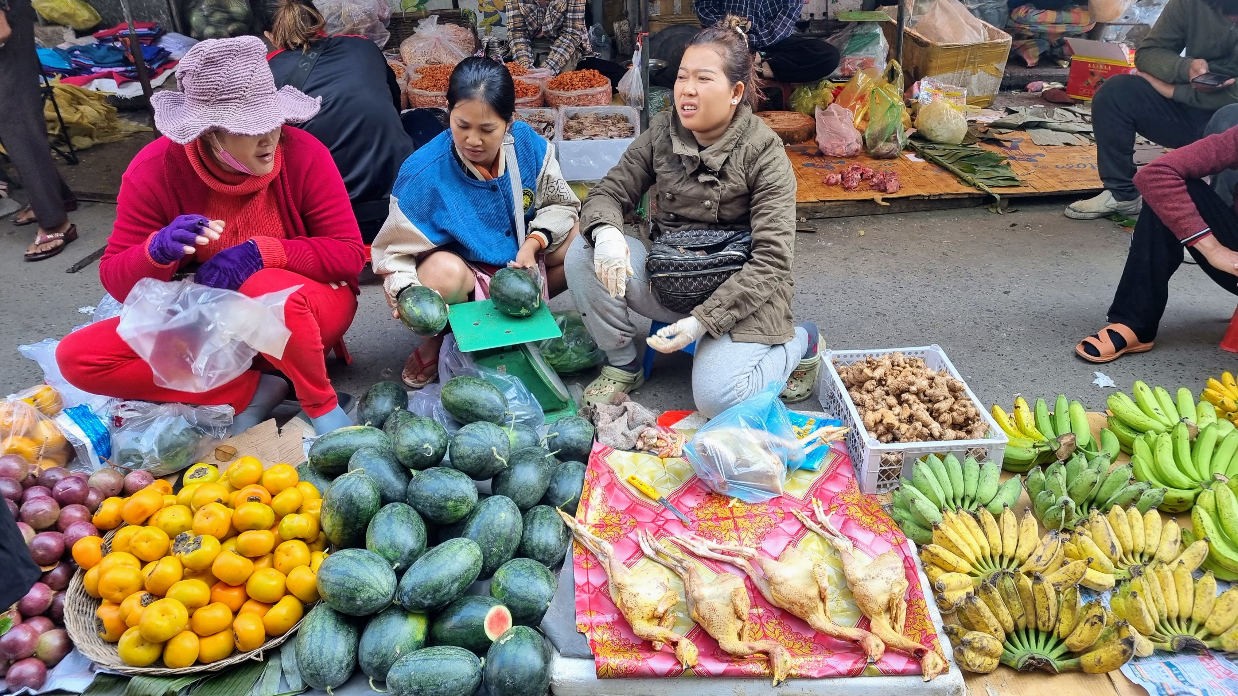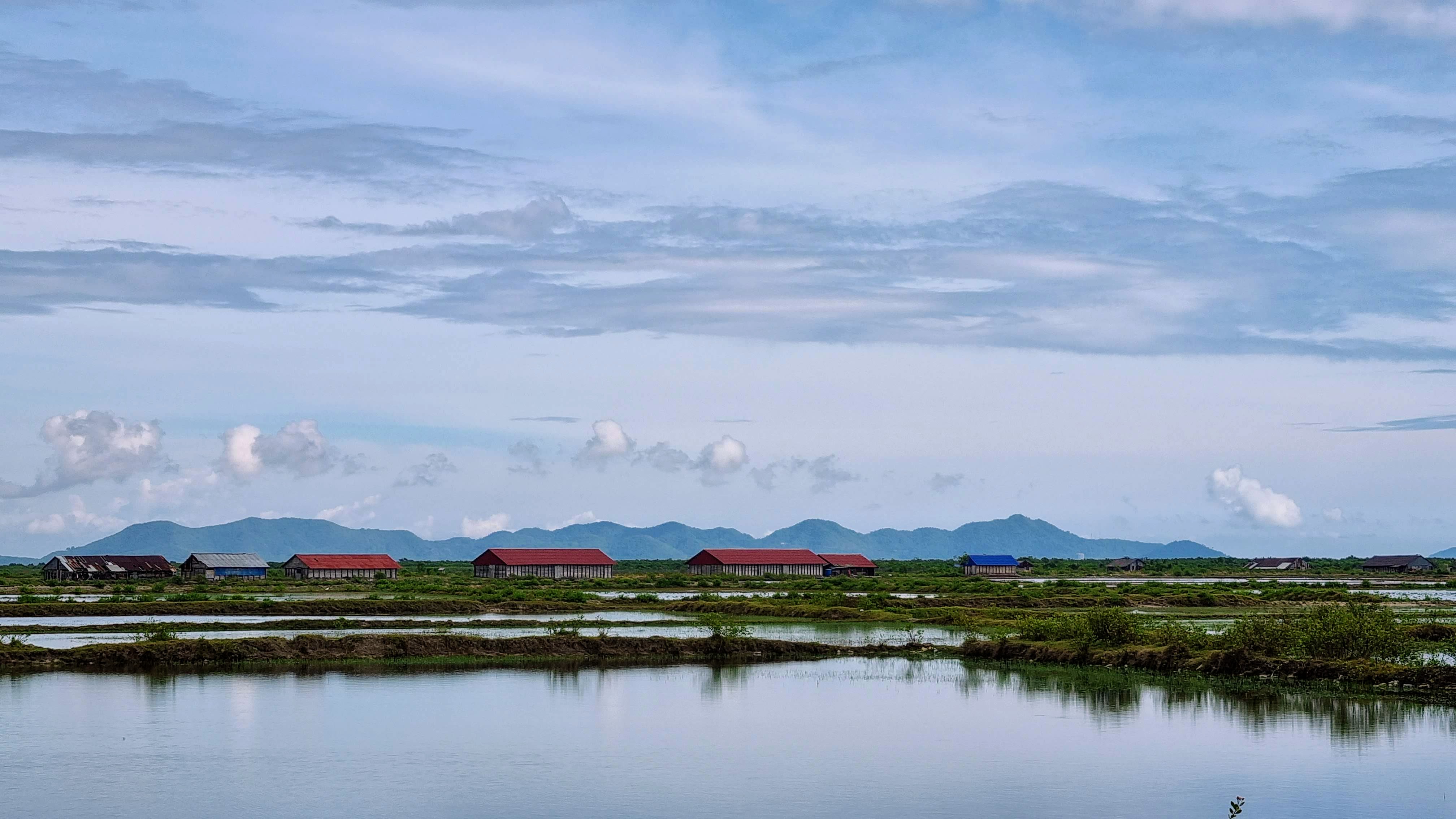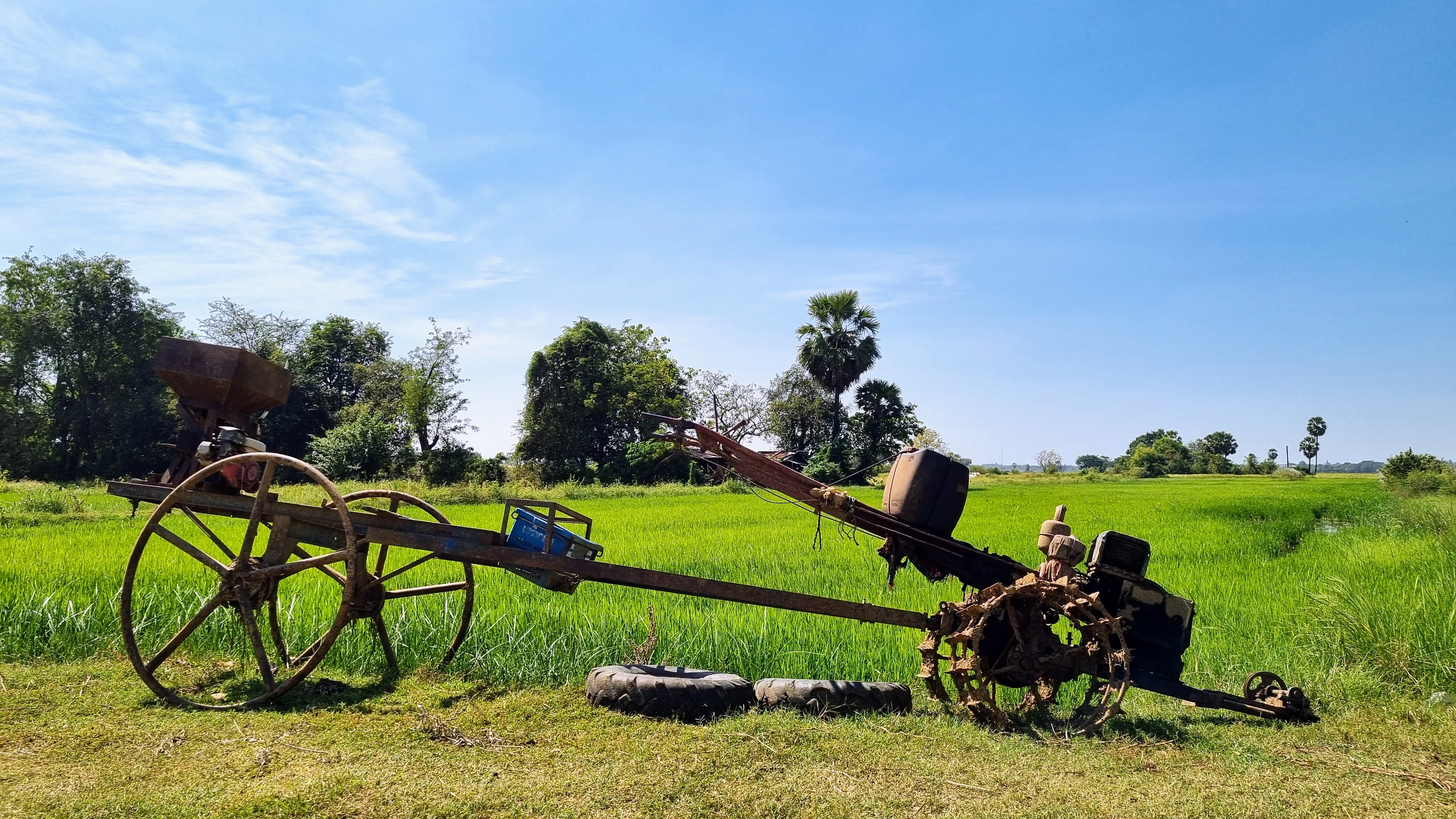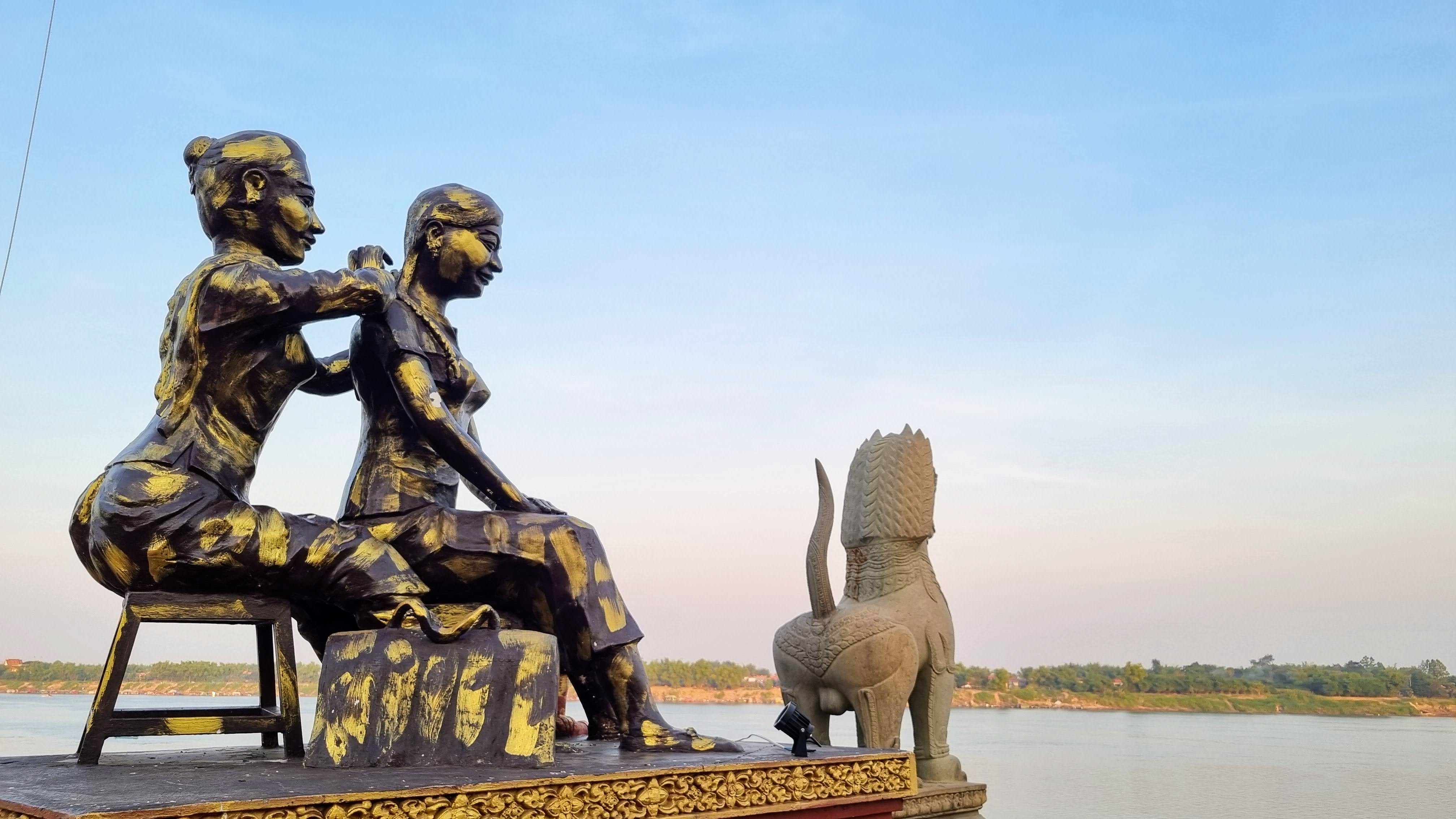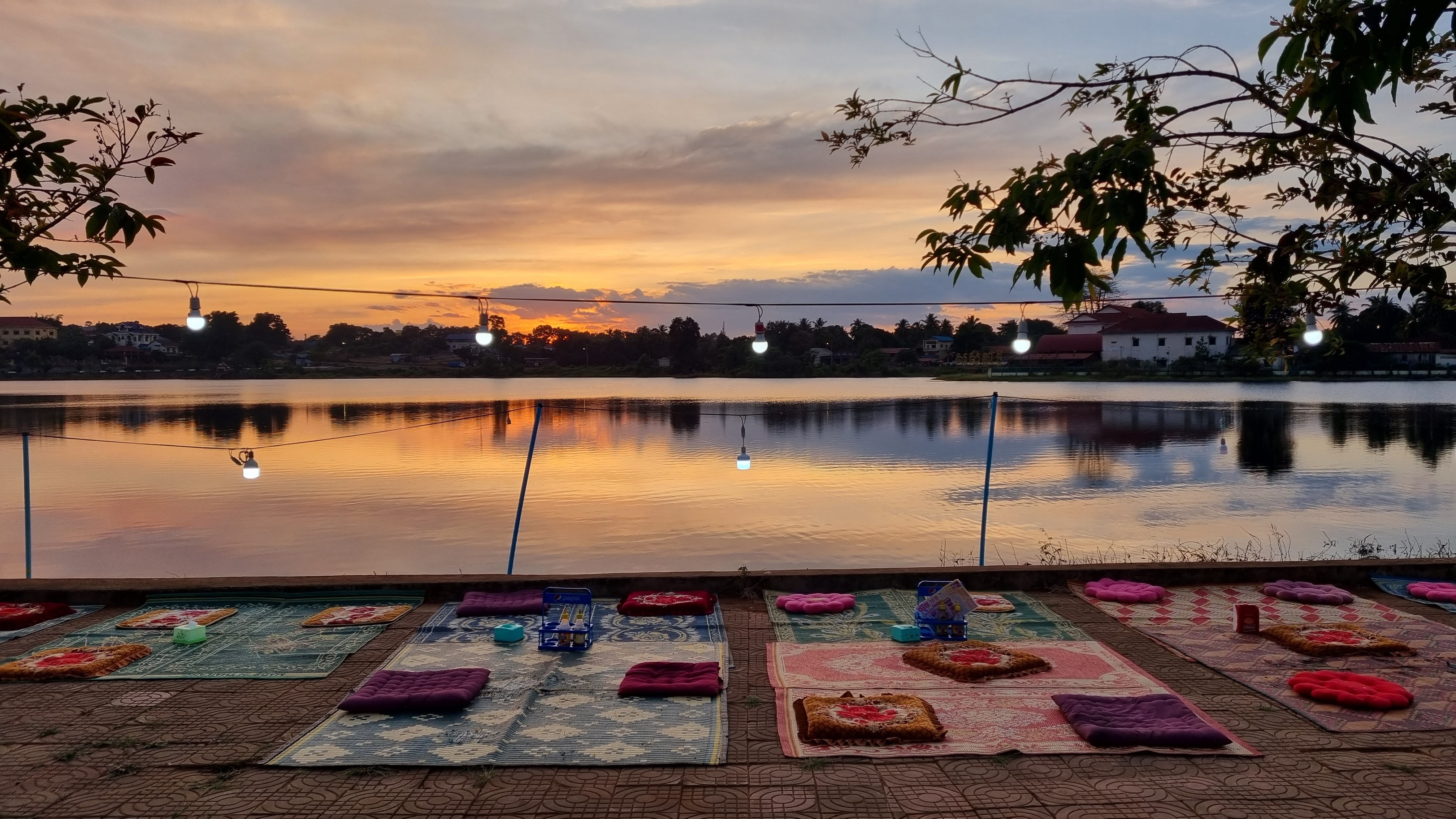 Bien que la ville soit petite, elle est le chef-lieu de la province du même nom. À peine sortis de la ville, nous traversons des hameaux et croisons des commerces en bord de route. On se retrouve rapidement sur des pistes poussiéreuses longeant des rizières d’un côté et le Mékong de l’autre.