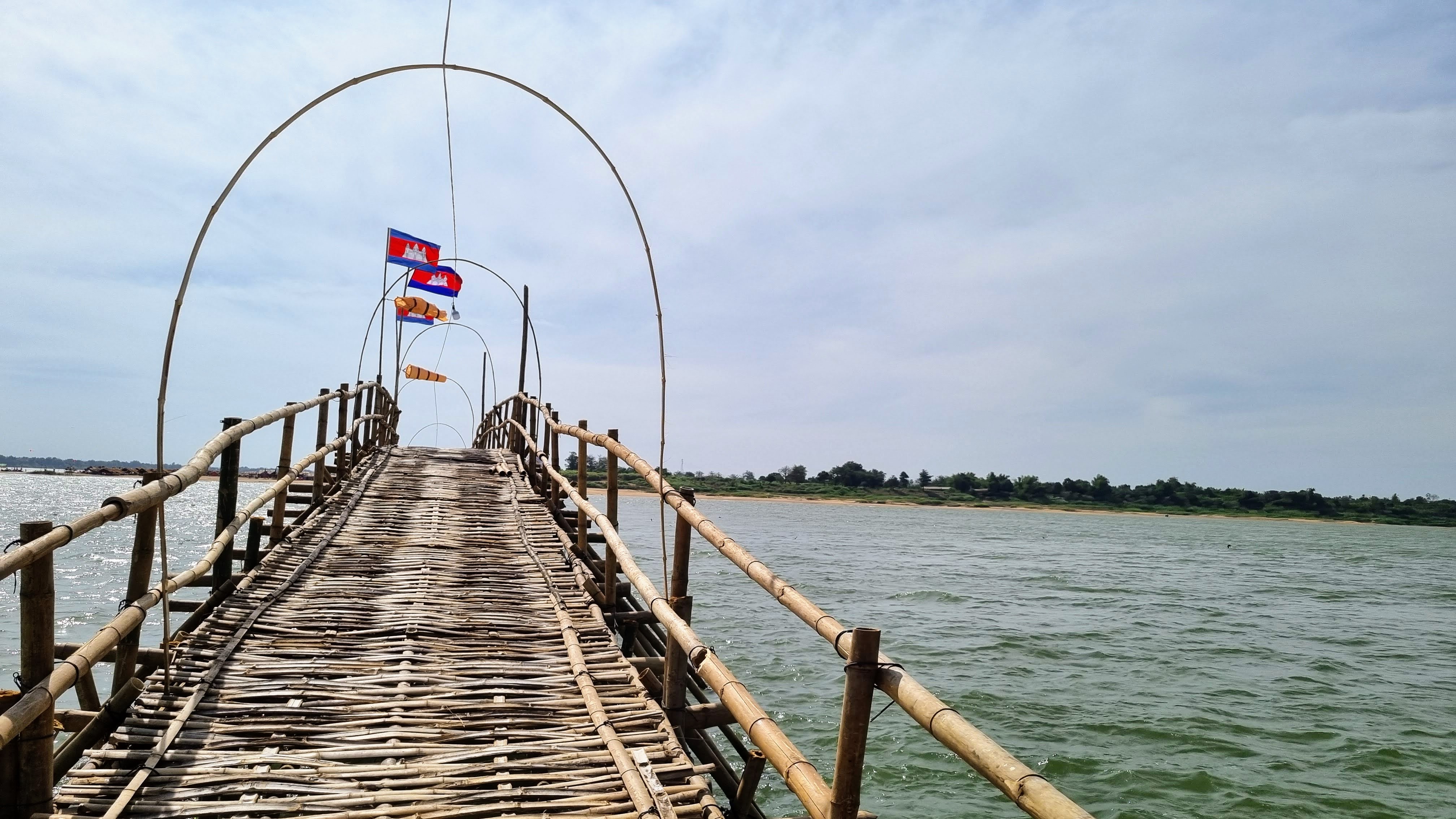 Un pont en bambou long de 800 mètres relie temporairement l’île de Koh Pen à la ville. Il est démonté chaque année durant la saison des pluies et les crues du Mékong, et il est reconstruit à la main par les habitants de l’île au début de la saison sèche. Ce pont en bambou, le plus long du monde est unique et est devenu le symbole de Kampong Cham.