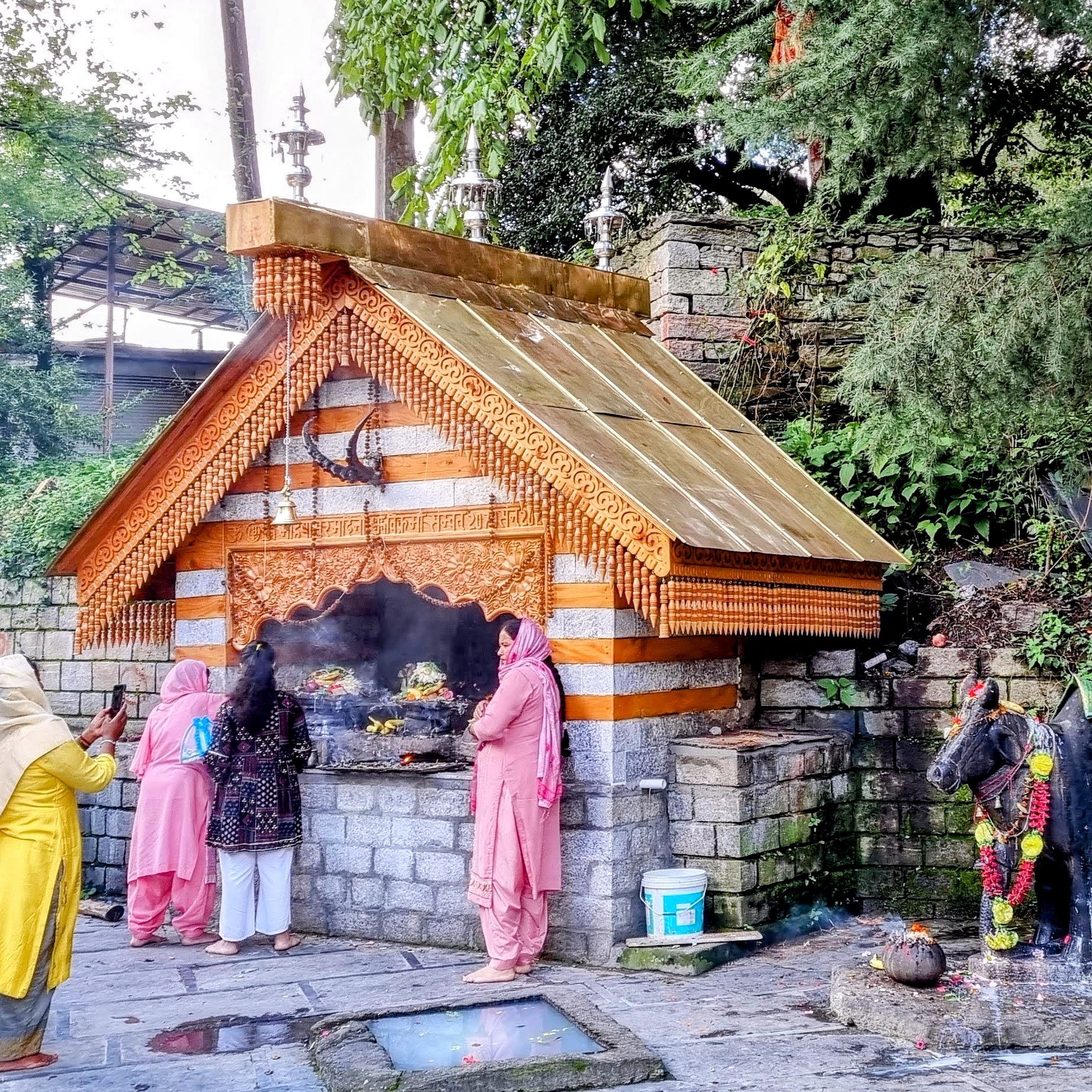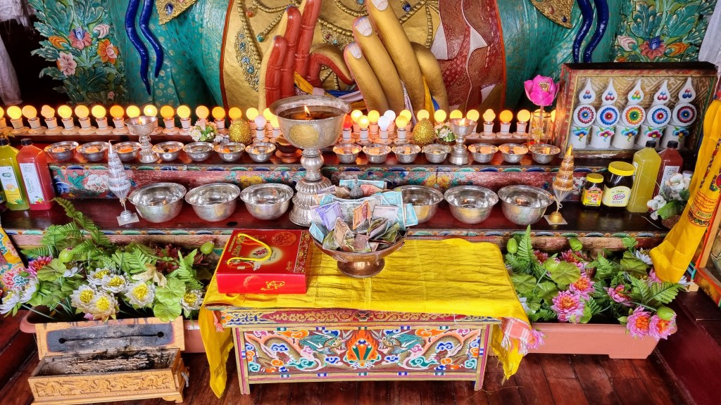 Dans tous les temples, des offrandes sont placées devant les divinités. Elles doivent être en lien avec l’un ou les cinq sens et incluent aussi de l’eau pour boire et se laver les mains, de l’encens, des fleurs, des lampes, du parfum, de la musique. Elles sont considérées comme un antidote à l’avidité et à l’attachement.