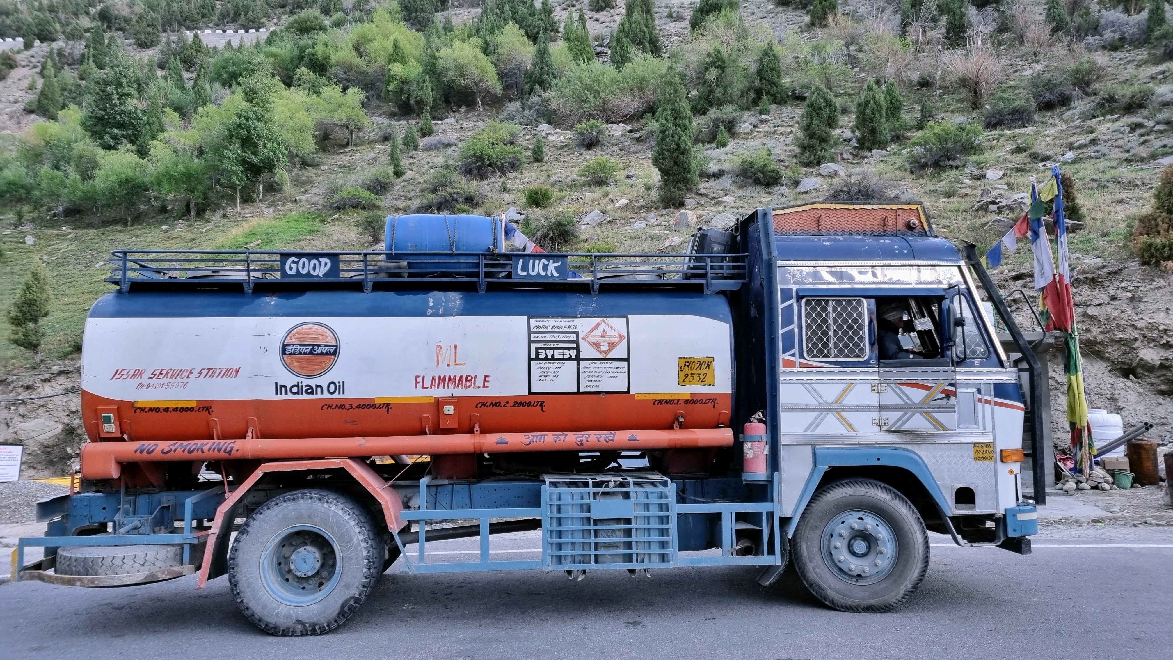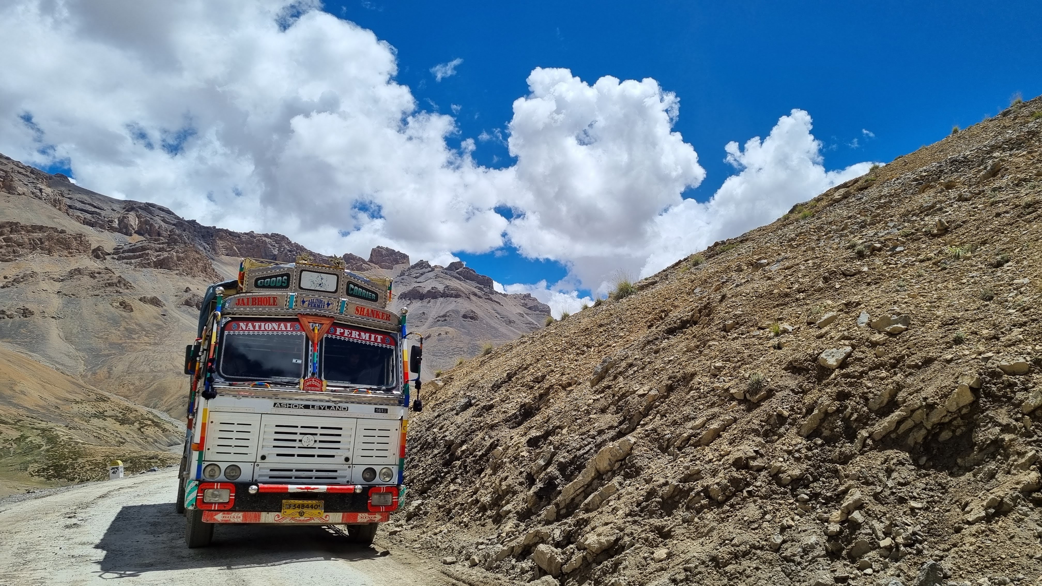 Malgré tout cela, chaque jour, des véhicules empruntent cette route parmi les plus hautes du monde. Des camions lourdement chargés pour livrer tout l’essentiel pour la construction de bâtiments, l’alimentation, de nombreux camions citernes de carburant. Et aussi quelques bus, des voitures et des motos.