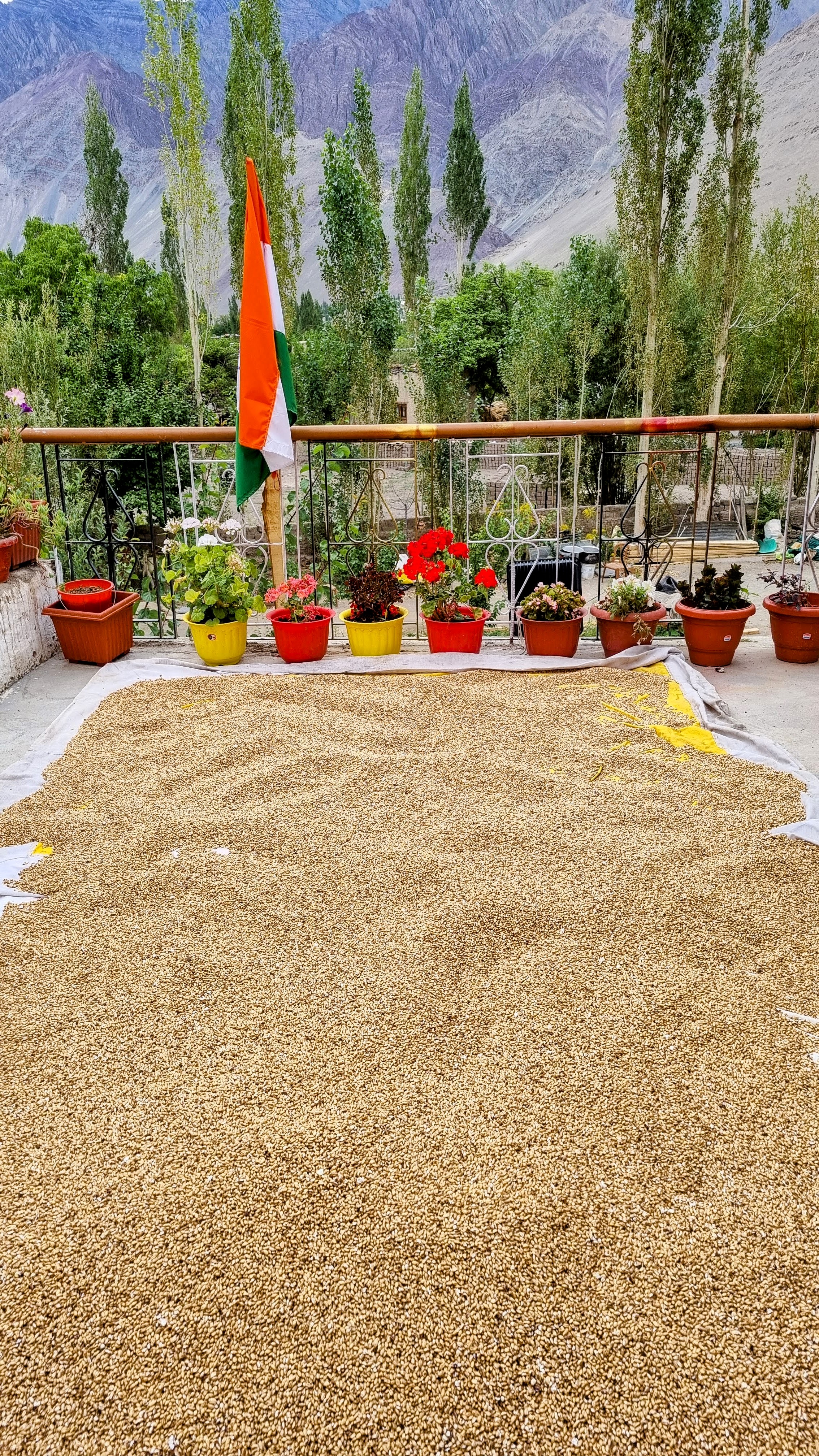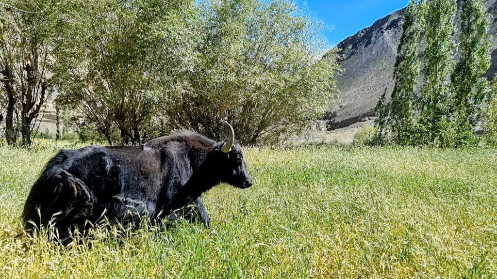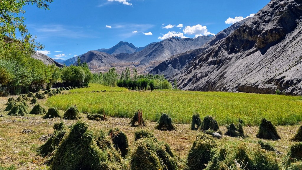 Lamayuru Les familles possèdent une vache ou deux et on peut voir quelques yaks au milieu des cultures. Sur les toits-terrasses des maisons sont mis à sécher les abricots, le blé, l’orge à peine récoltés.