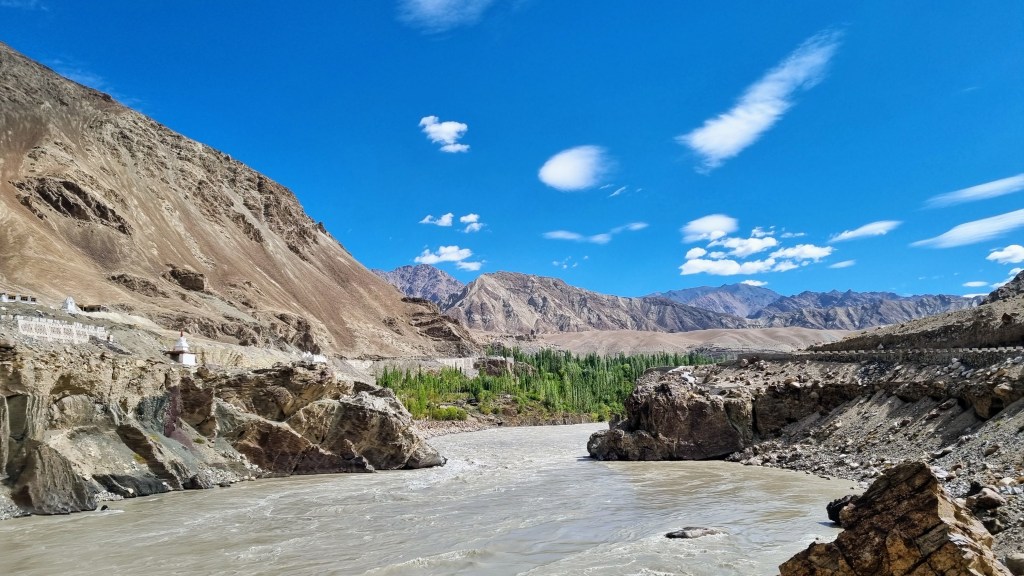 L’Indus, un des sept fleuves sacrés indien, prend sa source au Tibet, traverse le Ladakh avant de descendre vers le Cachemire Pakistanais et se jeter dans la mer d’Arabie.