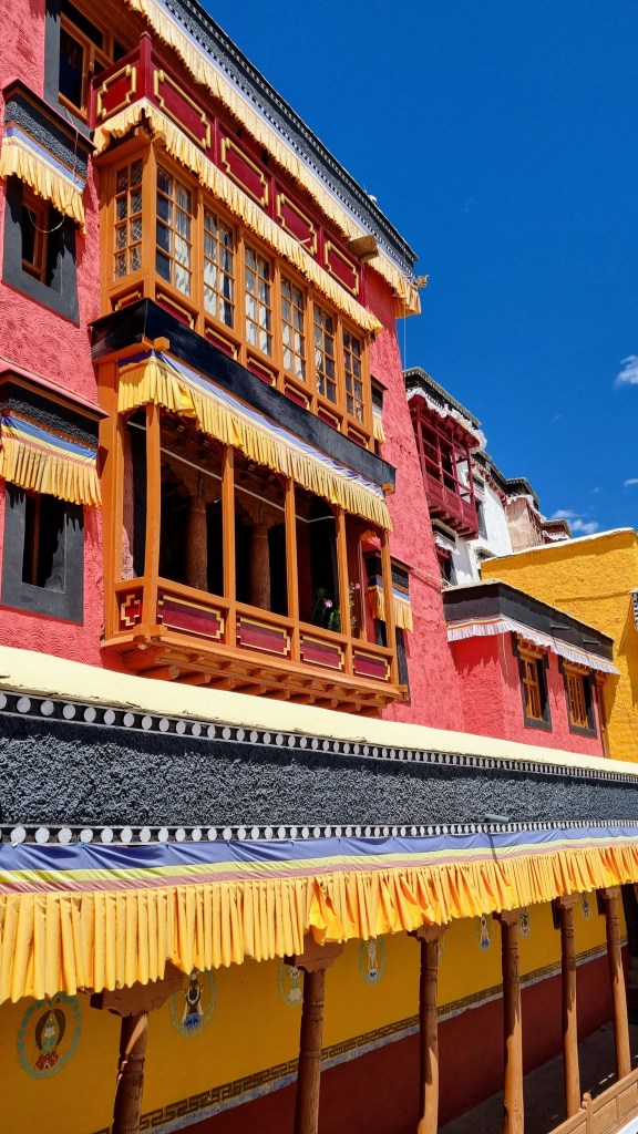 Le monastère de Thiksey est caractérisé par ses couleurs vives de ses murs extérieurs (rouge, jaune et blanc).