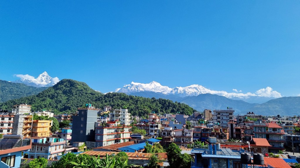 Pokhara située dans le centre du Népal, au bord du lac Fewa, dans une vallée entourée de montagnes, est la deuxième ville du pays avec une population de 200 000 habitants.