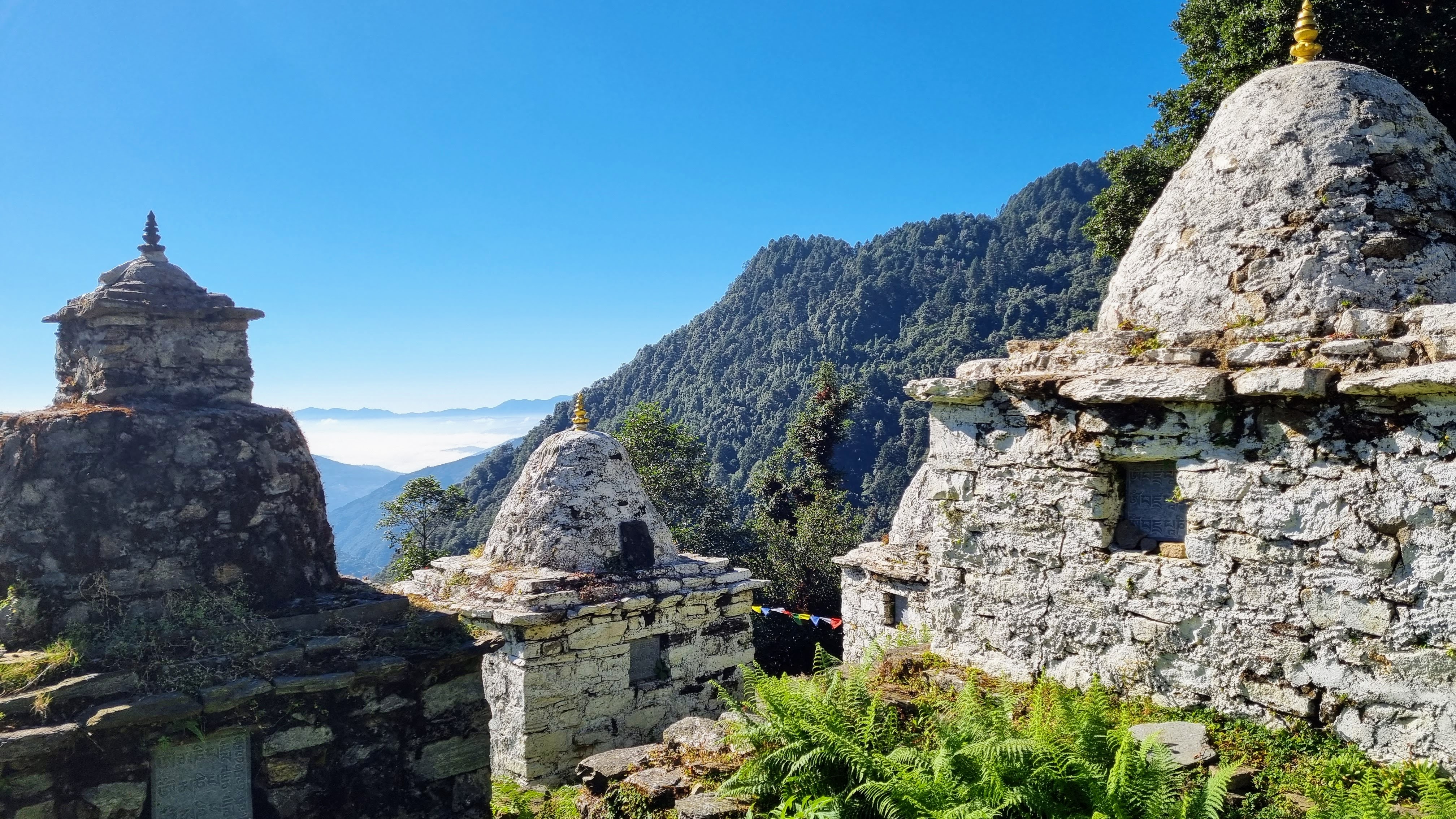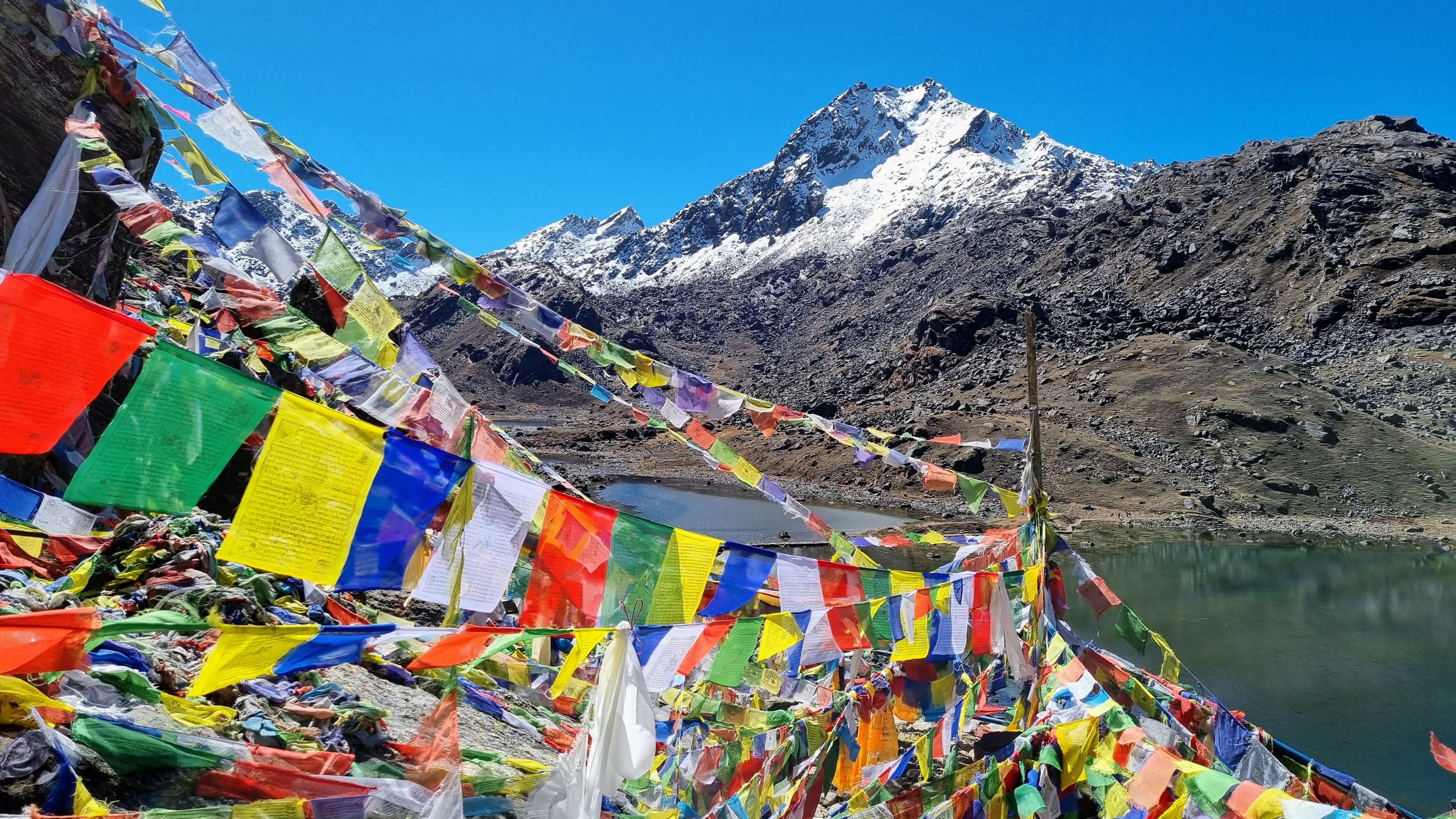 On peut y voir aussi de nombreux drapeaux à prières bouddhiques sur les sentiers de randonnées alentours.