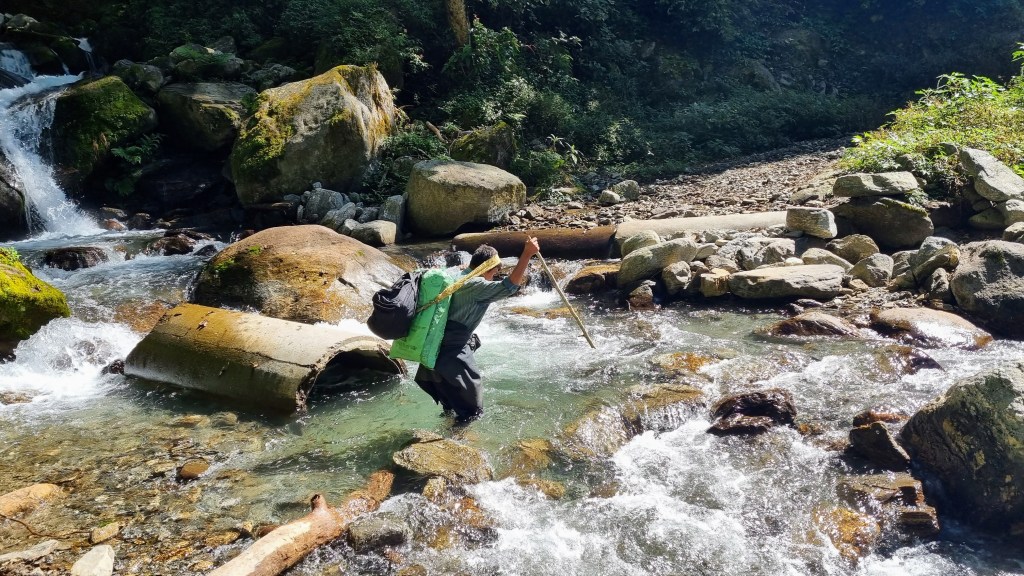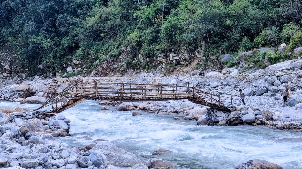 Lors des moussons de cet été, certaines voies permettant l’accés au district d’Helambu ont été coupé. Une partie des routes et des ponts est désormais détruite. Des infrastructures provisoires sont construites. Mais les véhicules motorisés ne passent plus. Seule la marche, hasardeuse par endroits, reste la seule solution pour rejoindre les villages plus bas.