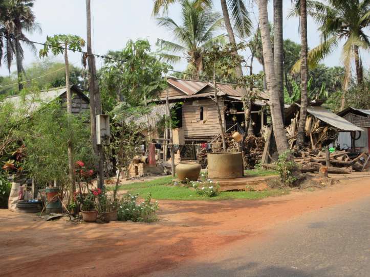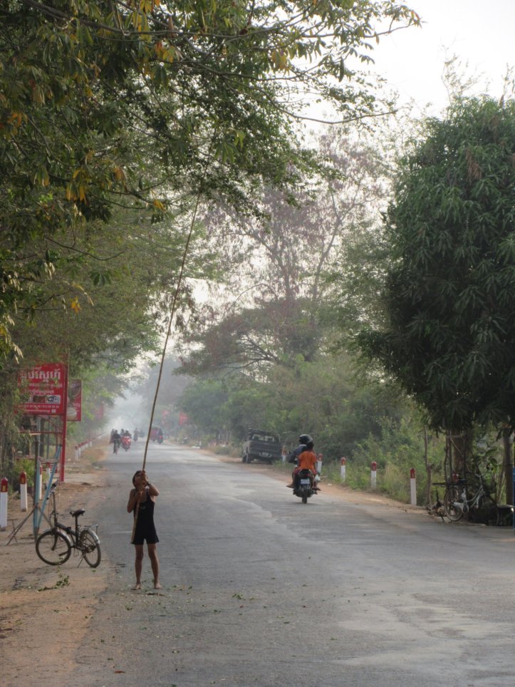 Nous avons décidé de rejoindre Tonlé Sap à vélos. Tonlé Sap est la plus grande étendue d’eau de toute l’Asie du Sud- est. A la saison des pluies, le Mékong vient gonfler le lac et est une source d’approvisionnement importante en poissons. Des pêcheurs y vivent à l’année sur des villages flottants. Ceci dit, si Tonlé Sap est la cible, notre objectif reste le chemin qui va nous y conduire. Comme à notre habitude, on accueille tout ce que la route veut bien nous donner. Nos sens sont à l’affût, nous disons « Oui » à tout ce qui passe. Nos routes cambodgiennes ne sont que rencontres inopinées, souvent touchantes. On fait la course avec les écoliers et les étudiants en uniforme. Un sourire, un geste de la main et c’est la classe entière juchée sur des bicyclettes qui pouffe de rire. Nous nous faisons momentanément clowns de rue.