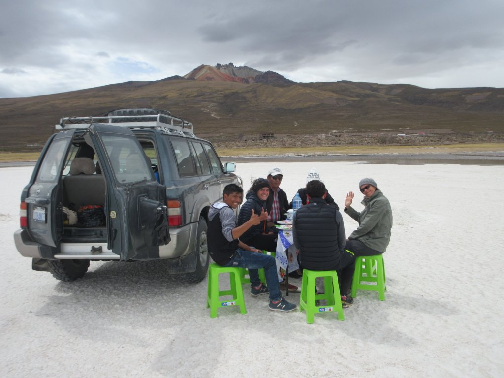 Installé au pied du volcan Tahua aux teintes oxydées, notre caravane, isolée du brouhaha du reste du monde s’invente un ermitage éphémère. 7 personnes déjeunent seules dans le désert de sel d’Uyuni.