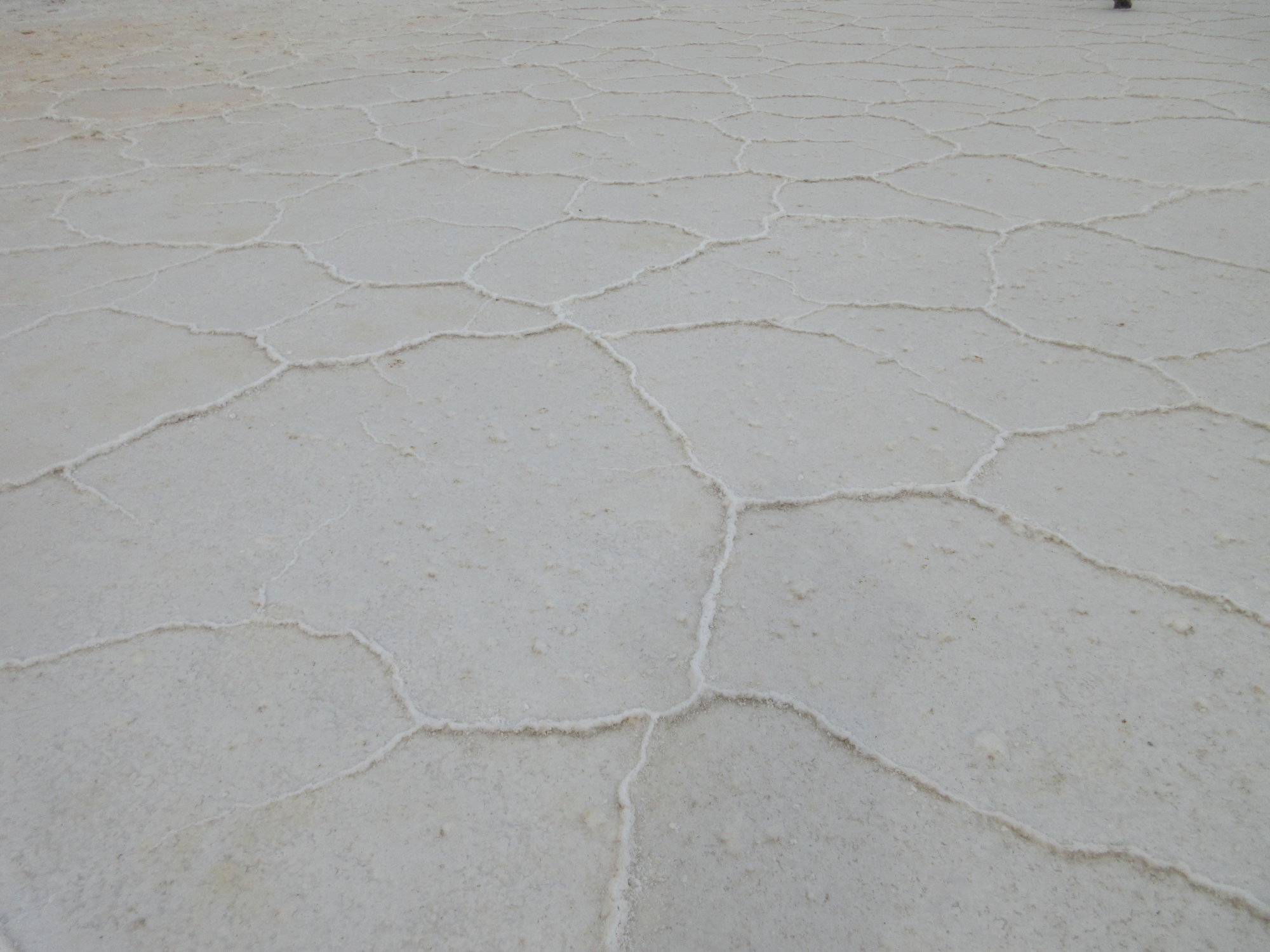 Ensuite c’est la blancheur à laquelle nos yeux ne s’habituent pas qui devient obsession. Où que le regard porte, nos pupilles se rétractent et tentent de résister piteusement à un brûlant éblouissement. Et notre peau séchée par le vent et le soleil opère une mue étrange jusqu’à former des centaines de polygones identiques à ceux laissés par le sel sur le sol. Sous nos pas, la surface dure et cristalline craquèle à peine et notre passage ne laisse aucune empreinte. On peut marcher des heures, courir des kilomètres sans arriver nulle part.