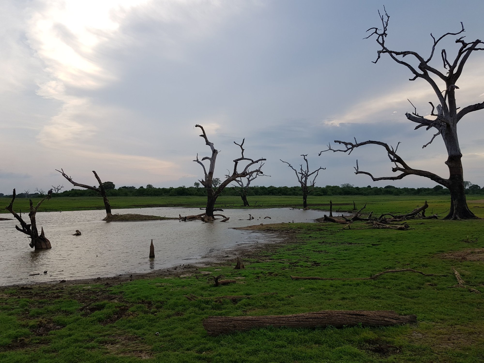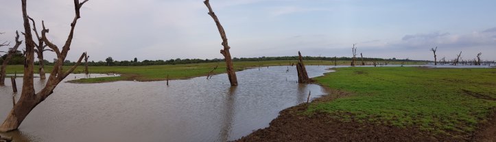 C’est une vaste plaine, recouverte en partie par l’eau d’une retenue créée par l’homme. On y accède avant que la nuit ne tombe, par les pistes de latérite. Au milieu de ce paysage de savane, les virages, les bosses et les ornières « terre de sienne », surprennent l’oeil autant qu’ils secouent et inventent une géographie routière sanguine desservant l’immense territoire. Inventant la verticalité, les squelettes argentés d’arbres pétrifiés relient la terre au ciel. Le graphisme soigné et les jeux d’ombres, comme façonnés par un artiste contemporain, donne à chaque nouvelle rencontre la vue d’un chef d’oeuvre unique.