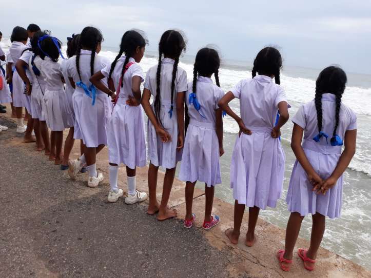 Et puis nous avons croisé de jeunes écolières en uniformes. Le ciel gris accordait une accalmie provisoire aux badauds, de violentes vagues s’écrasaient à leurs pieds dans d’hypnothiques explosions d’écume, le bruit sourd de la ville et ses klaxons incessants cognaient au dos. Le vent brassait toutes ces énergies dans une moiteur tropicale.