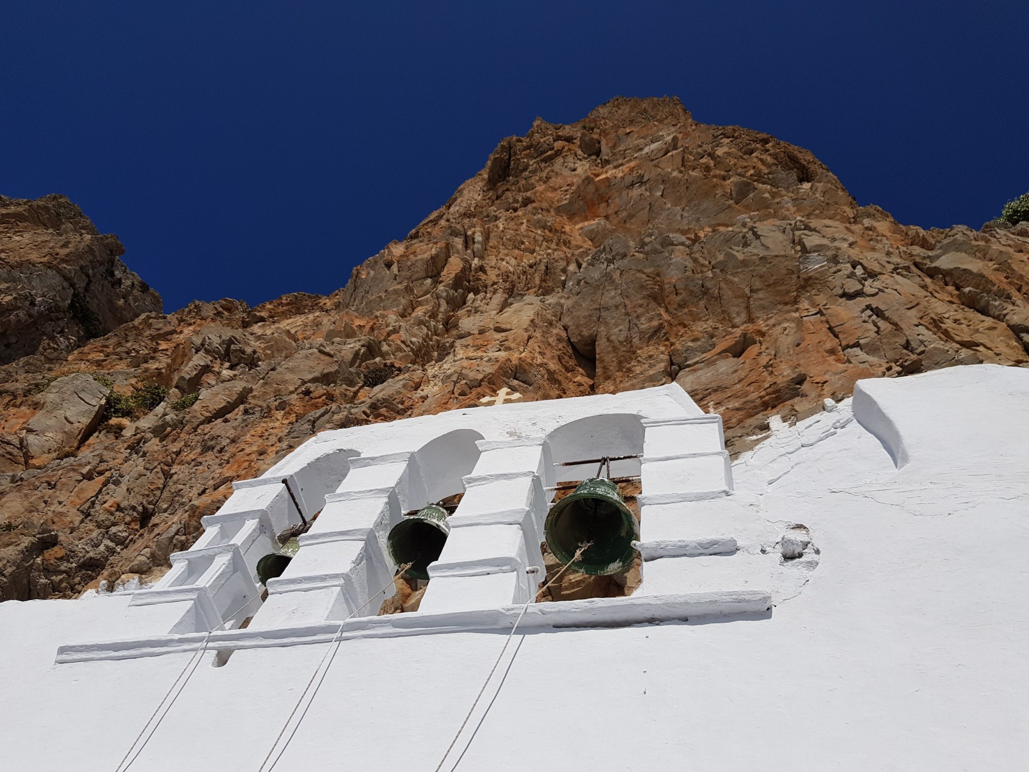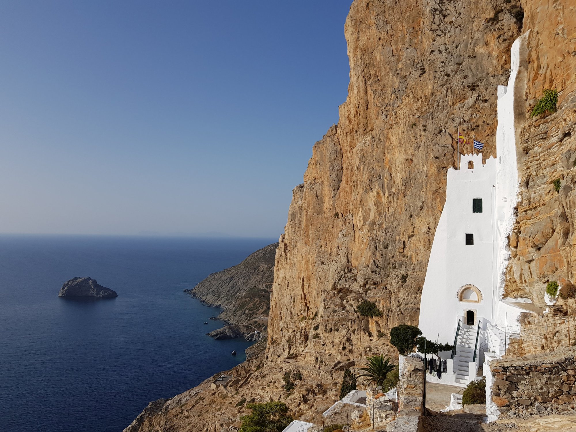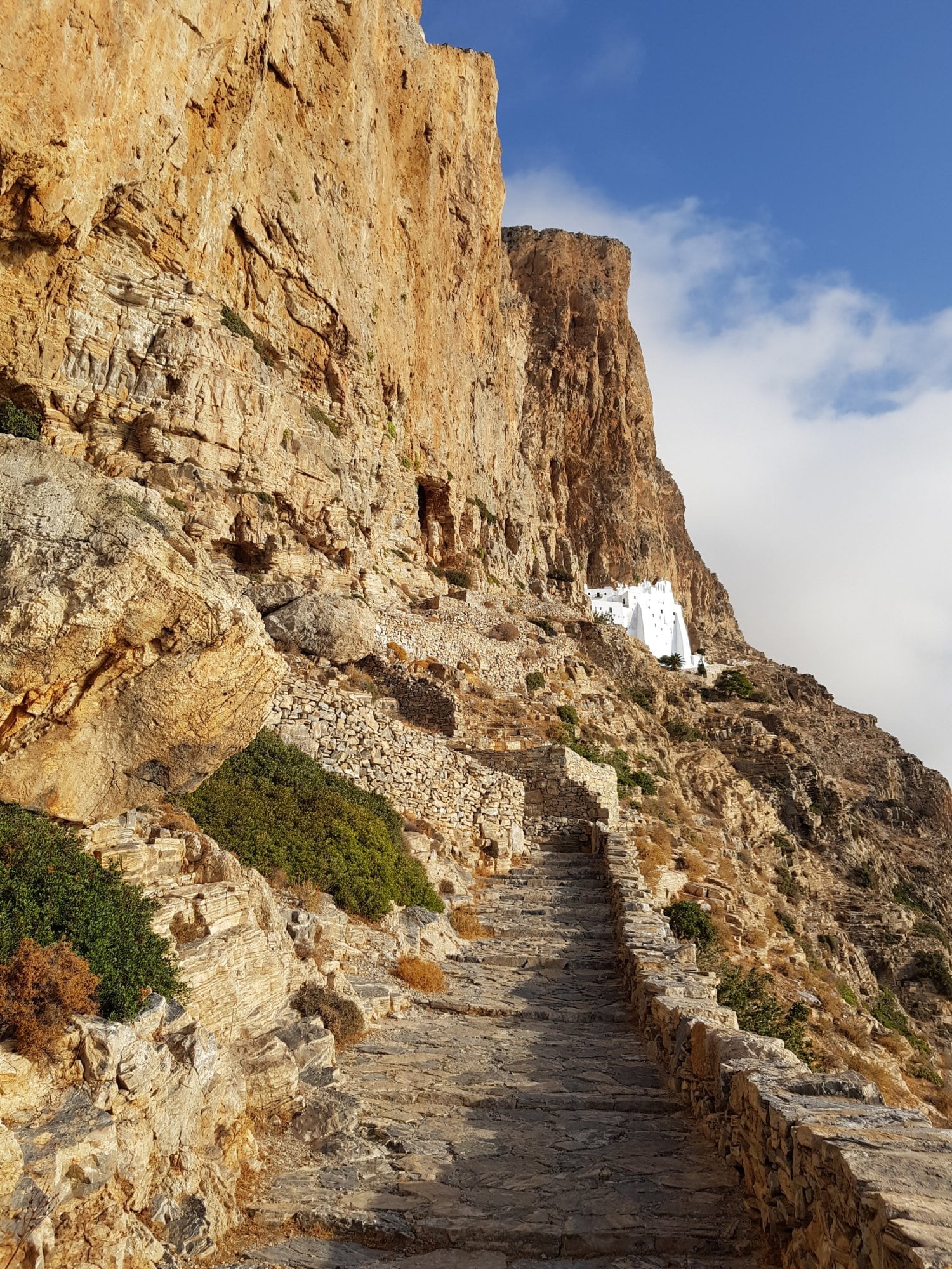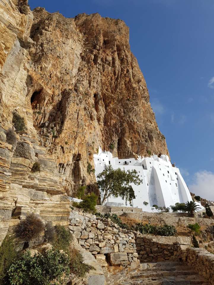 Sur Amorgos enfin, il existe un incroyable monastère accroché à flanc de montagne. Quelques centaines de marches pour y accéder et comme récompense là-haut, un verre d’eau, des loukoums et un verre de raki. De quoi y passer l’éternité.