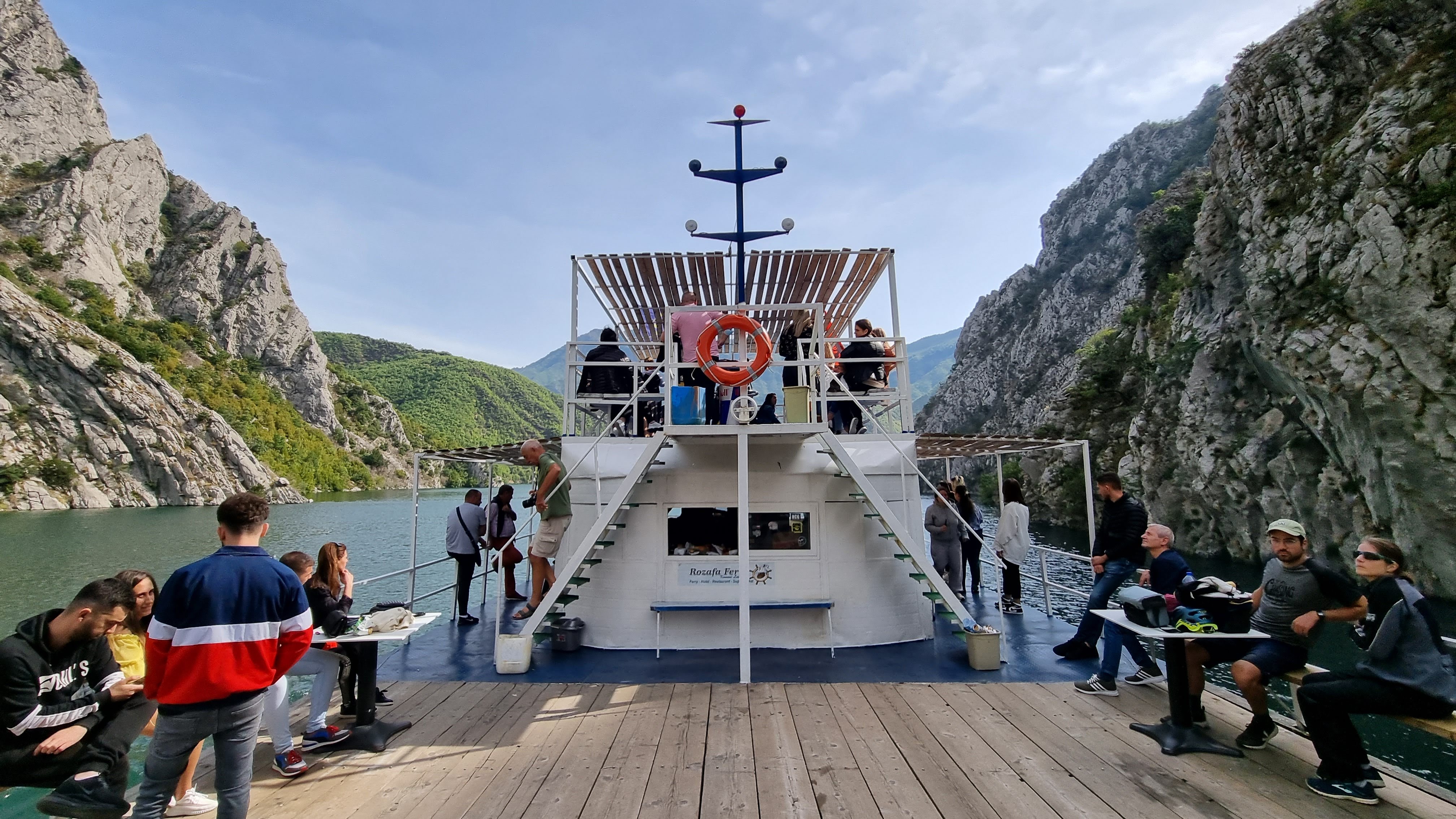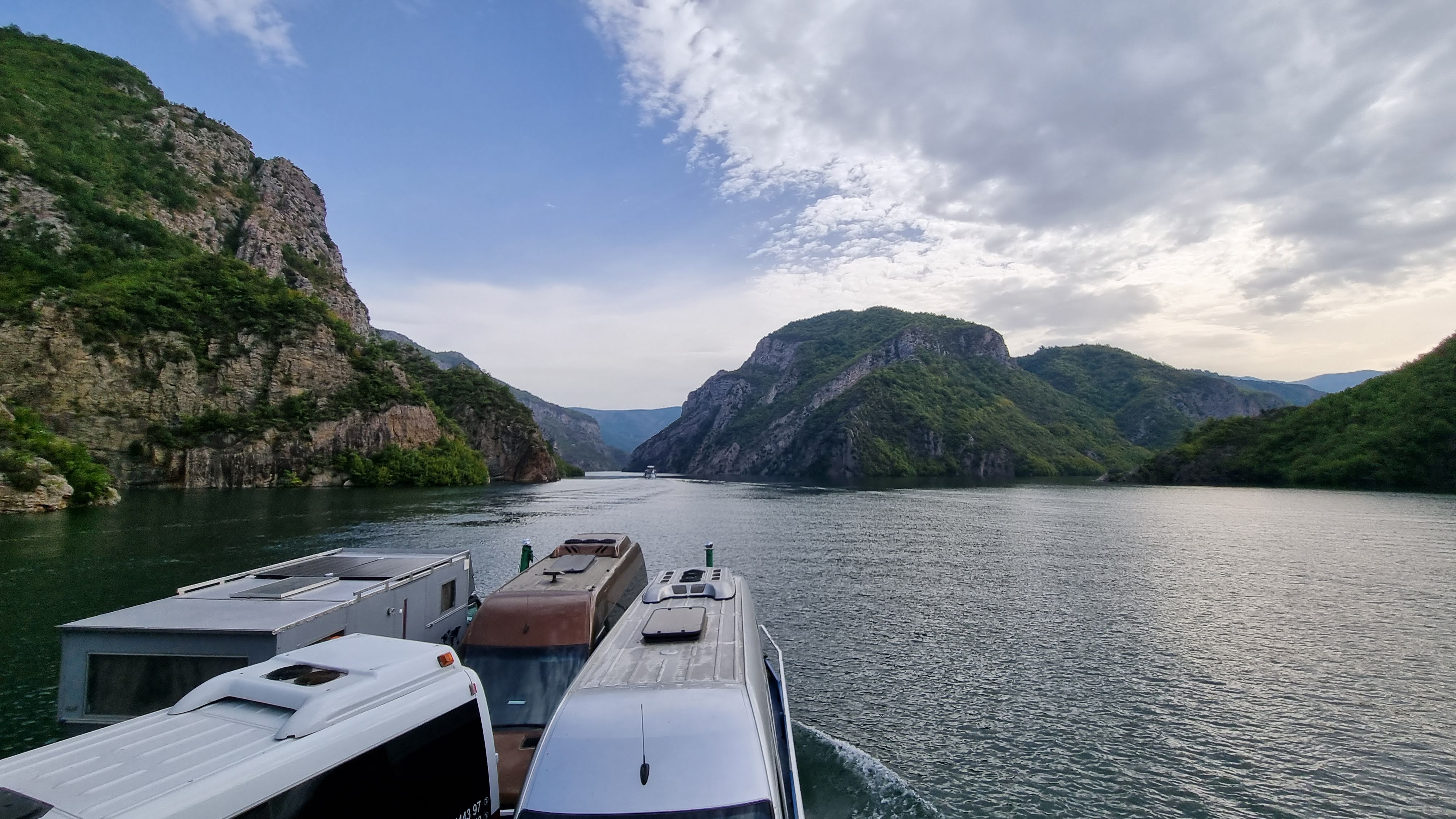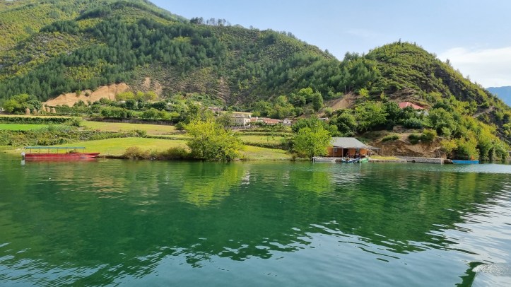 Après une heure de bitume puis une autre de piste en lacets, un minuscule quai d’embarquement maritime, foisonnant d’activité, annonce la fin de la route. Le lac de Koman est une retenue d’eau artificielle qui s’étend en longueur, empruntant le lit de la Drin, le plus grand fleuve d’Albanie, sur un axe nord sud durant une trentaine de kilomètres.