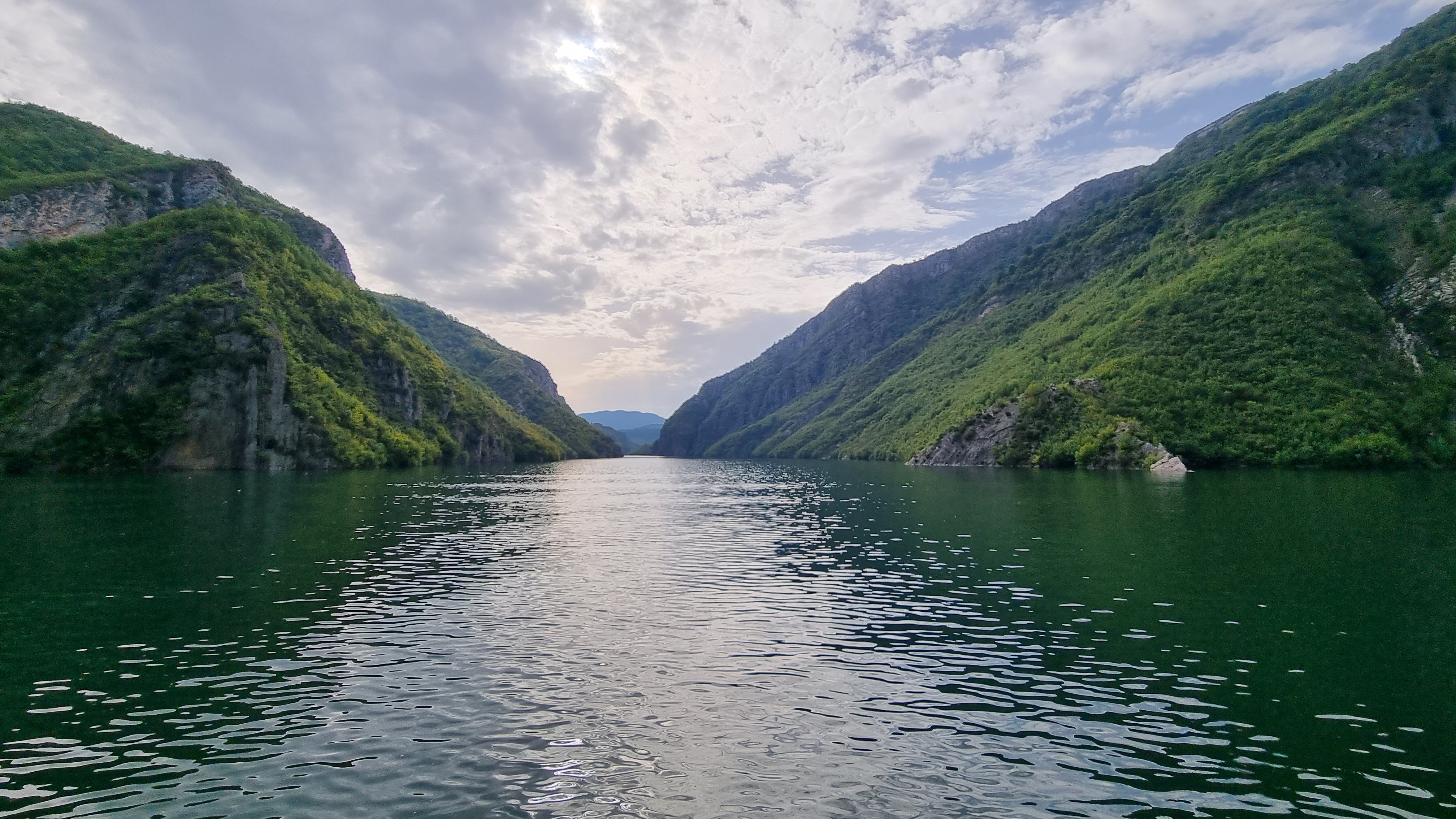 Les bateaux y transportent chèvres, chevaux, motos et tout autres véhicules carburant au foin ou au diesel et également quelques randonneurs innocents tournant à la bière locale pour passer le temps jusqu’au village de Fierzë, porte d’entrée des Alpes dinariques dans ce coin du monde. Une eau émeraude s’étend nonchalamment sous le regard écrasant de hautes parois abruptes de montagnes alternant au détour des virages avec les courbes douces de collines végétales. Un décor de bout du monde qui appelle à la rêverie, une navigation rythmée par le ronronnement d’un vieux diesel, les pépiements de quelques jeunes albanaises en goguettes, il y a quelque chose qui ressemblerait à une vie paisible sur un long fleuve tranquille.