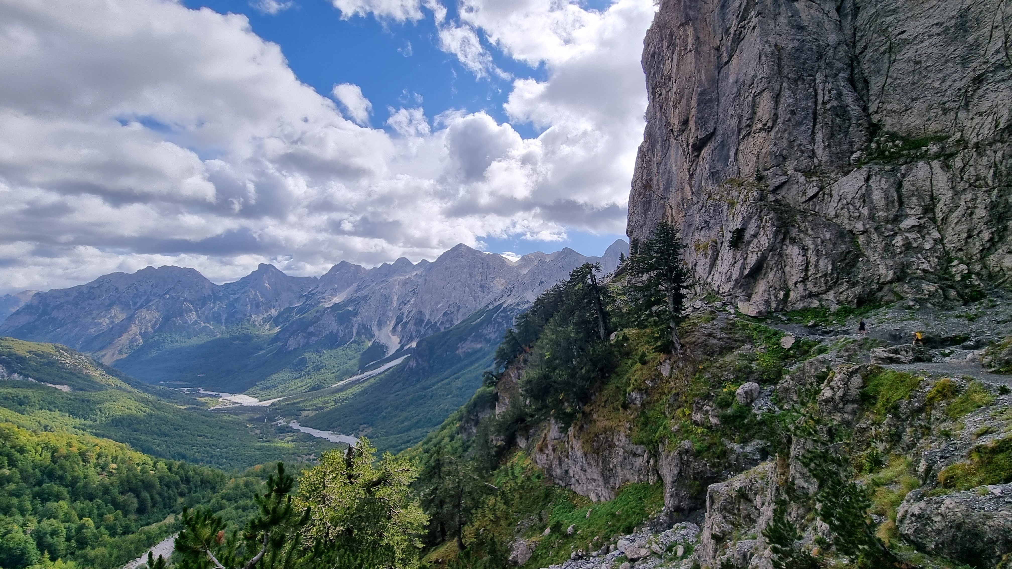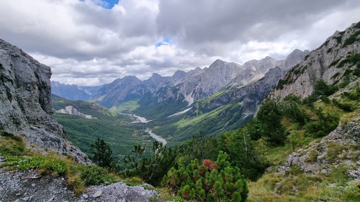La suite de l’ascension fût moins humide. On trouva aisément la passe pour franchir le col et à 11h00, un panorama sublime sur la vallée de Theth s’offrait aux regards. Le ciel se teintait de bleu, le vent soufflait au sommet, nos vêtements sécheraient certainement durant la descente qui nous attendait. La montagne était renversante de beauté, et si les pieds étaient mouillés, les cœurs, eux, étaient légers.
