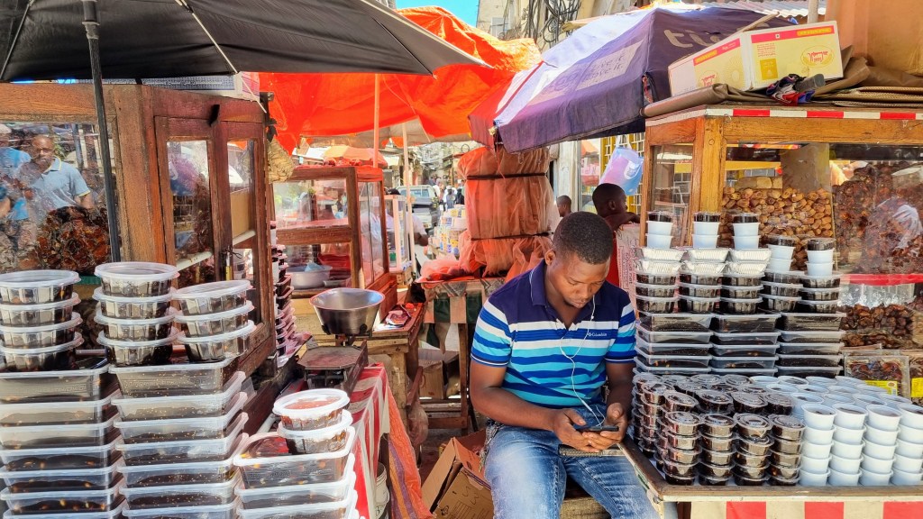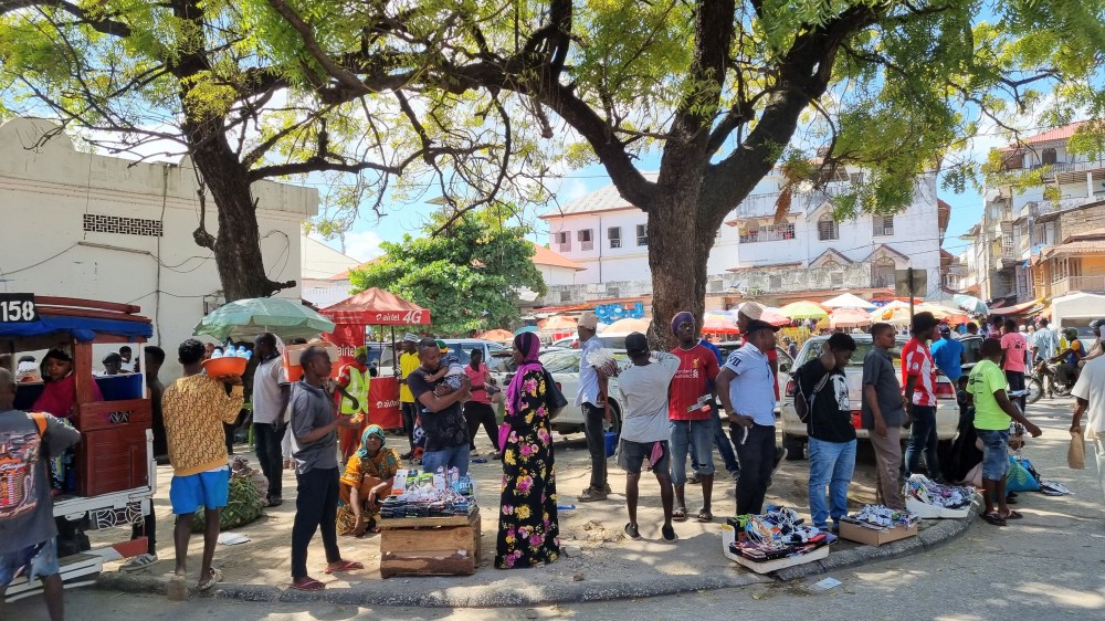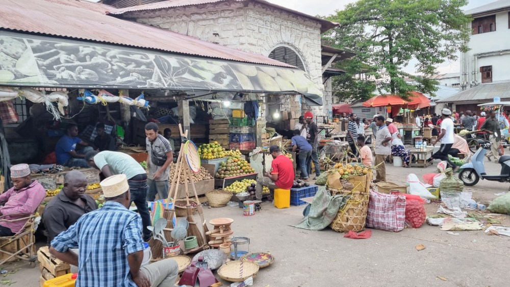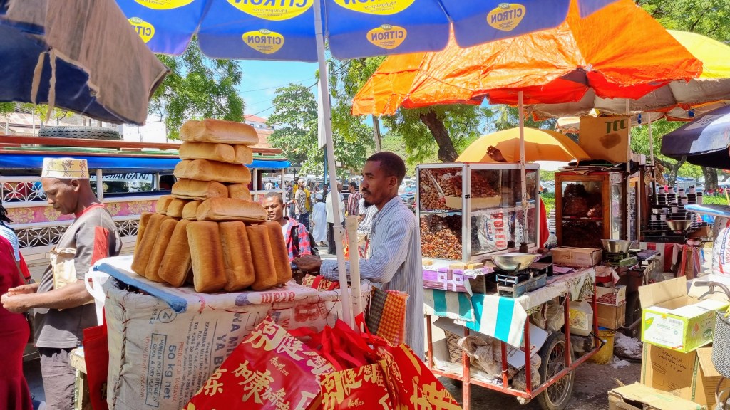 Enfin Stone town était ce marché tapé de soleil, éparpillé de couleurs fruitées, de pyramides de pâtes de dattes, d’étals de poissons et de pots d’épices, de gingembre et de bananes sucrées minuscules, de paniers en osier gavés de pains frais rectangulaires que la vendeuse enveloppait dans une feuille de papier journal en le tendant. Un marché braillant, avec ses porteurs d’œufs aux portes des minibus, criant qu’il fallait tout vendre, tout acheter maintenant dans un tourbillon de poussière et de vie.