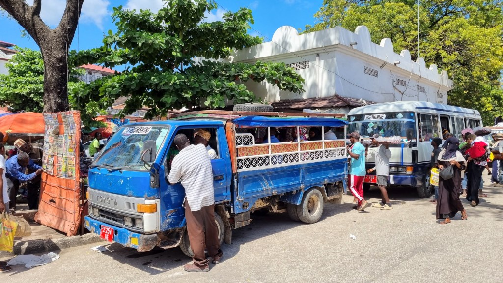 Arrivés à la gare routière qui n’est en fait qu’un alignement de mini-bus au milieu du marché, on nous indique le prochain qui se rend à Nungwi. Celui-ci part seulement fois plein.