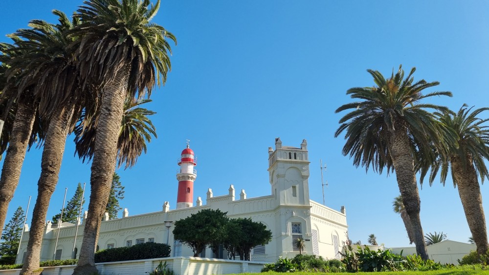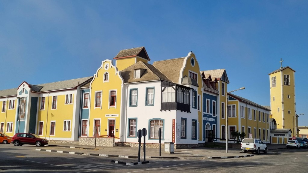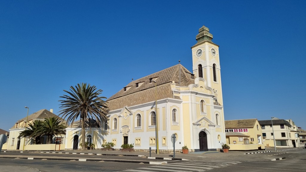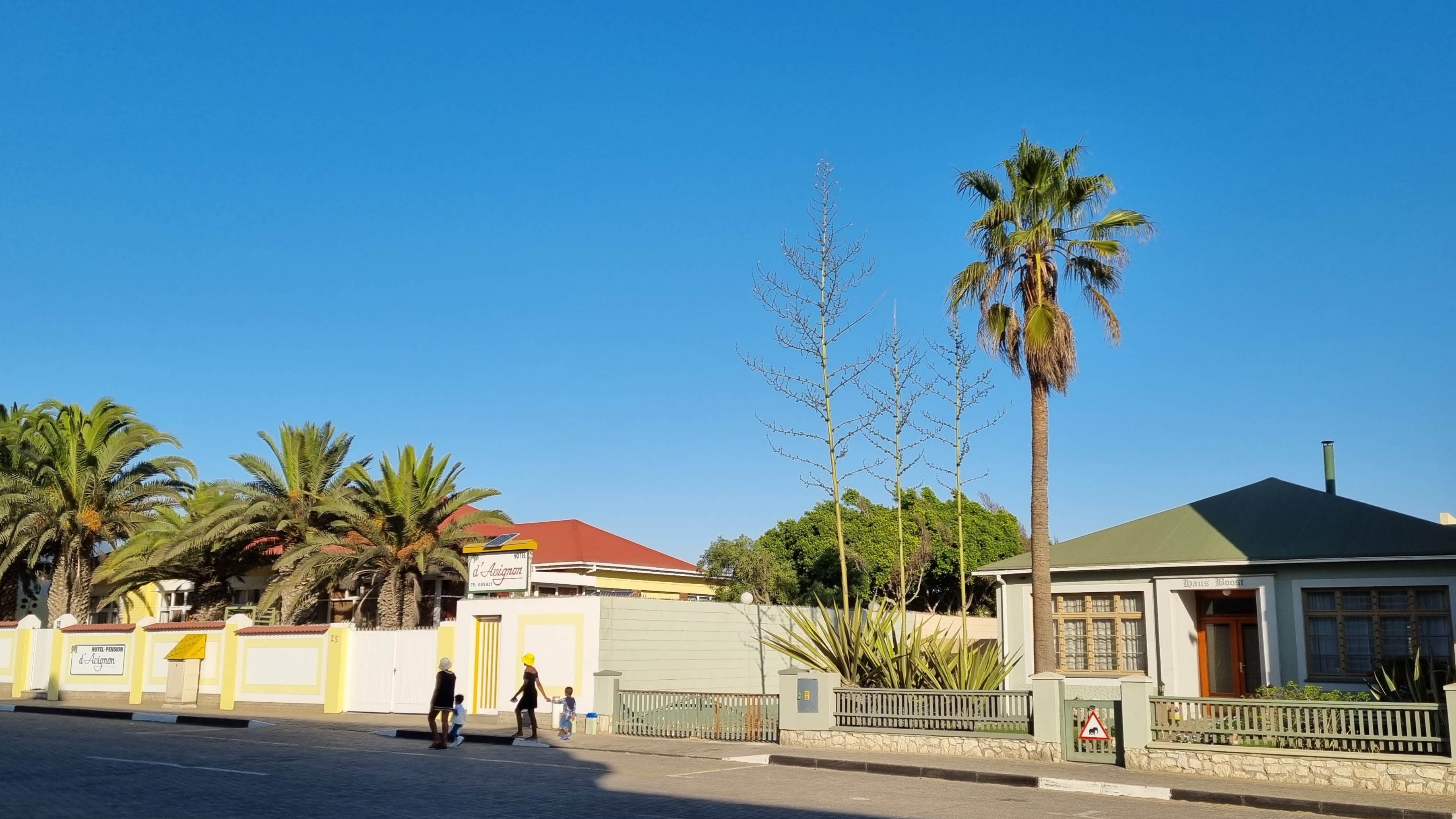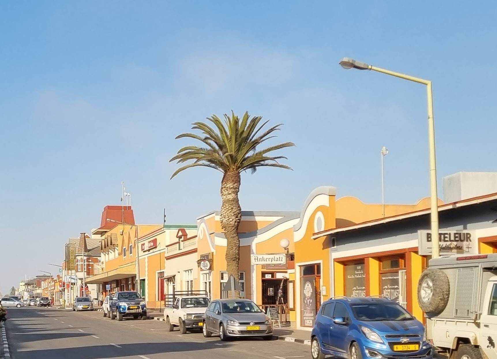 En restant dans le prolongement du ponton, on entre dans le centre ville par l’avenue Libertina Amathila, combattante de l’indépendance, première femme médecin et politicienne au destin national. Quadrillée par de larges avenues, presque démesurées en comparaison du nombre de véhicules y circulant, la ville aligne des rues adjacentes en sable damé, ce qui en rajoute à l’atmosphère presque estivale de nos déambulations, bien que nous soyons en hiver.