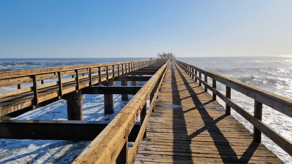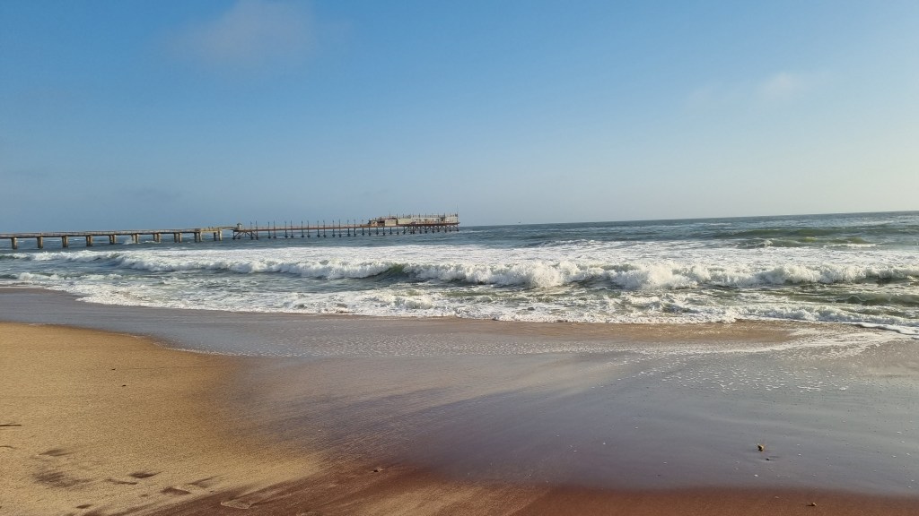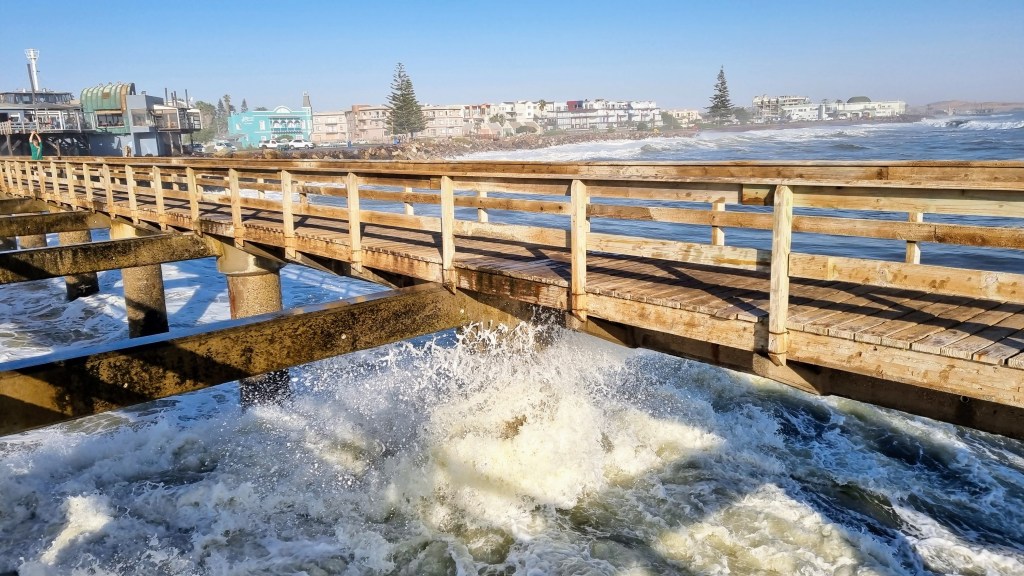 S’il fallait choisir un point de vue, c’est sans doute depuis le bout de la jetée, au milieu d’un océan houleux, que nous aimerions observer Swakopmund. L’édifice fût construit par les allemands à l’époque coloniale au début du vingtième siècle, souhaitant alors faire de la ville un site de débarquement pour s’y installer. L’absence d’eau profonde et la violence de la mer dû les contraindre à concevoir cette jetée aux fondations de bois puis de métal, longue aujourd’hui de trois cents mètres et désormais emblème de cette ville de bord de mer.