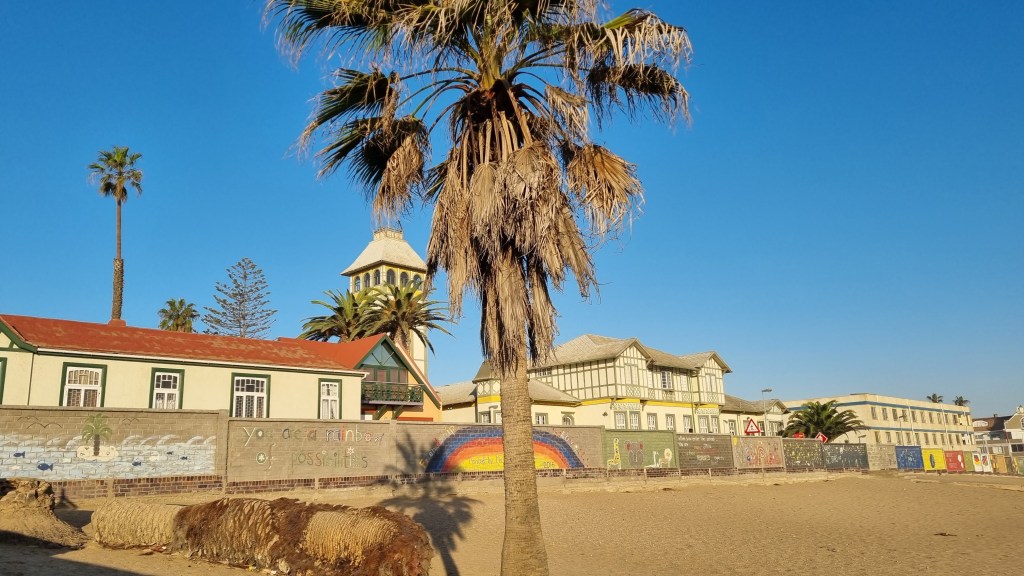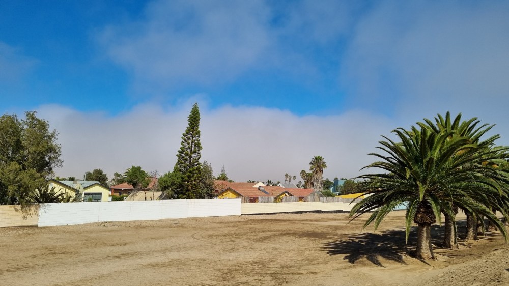 Au sud, les rues déboulent sur des dunes de sable où un halo jaunâtre colore le ciel lorsque le brouillard marin s’en mêle. Depuis les planches en bois, on voit le soir les dunes dorées, alanguies, descendre vers la mer, rappelant la proximité immédiate du désert du Namib à la sortie de la ville.