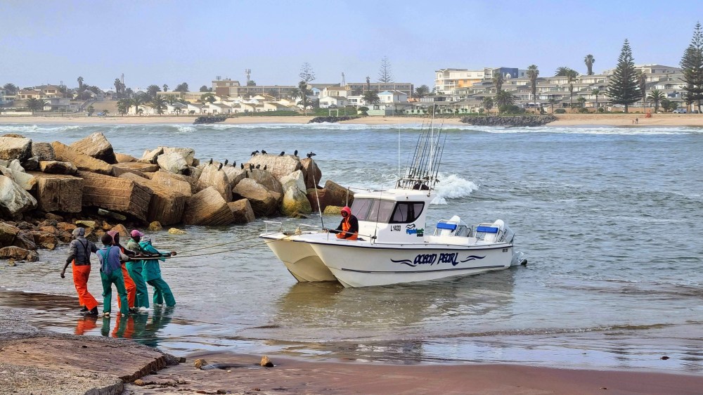 Ce soir, sur la plage de sable rouge de Swakopmund, le roulis de l’océan efface les pas derrière nous. Des hommes tirent sur une amarre et sortent un bateau de l’eau. A quelques mètres de là, deux dauphins jouent dans les ondulations des vagues. Le vent d’hiver déferle sur les visages, tandis qu’un halo de sable irisé s’élève dans le ciel et signale la proximité des dunes du Namib.