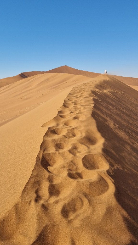 Avant que le jour ne se lève, nous étions aux portes du parc, attendant impatiemment, en avalant notre petit déjeuner dans la voiture, que le garde ouvre la barrière. Nous empruntions ensuite, étrangement, une route bitumée au milieu du canyon de Sessriem sur près de soixante-dix kilomètres pour atteindre le site, puis lâchions la voiture pour filer à pied aux dunes.