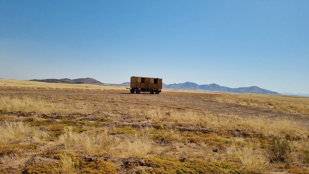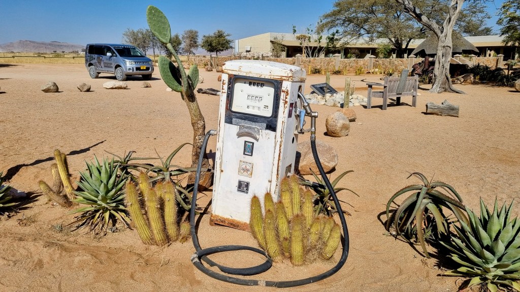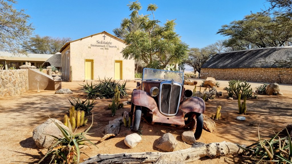 Le lieu-dit Solitaire permet en cours de route de faire le plein d’essence et de contrôler la pression des pneus, qui nous inquiète depuis qu’un voyant sur le tableau de bord nous sommait, une vingtaine de kilomètres auparavant, de se garer sur le bas côté afin de régler un problème encore non décelé. ll était certain que les secousses constantes de la piste ne devaient pas épargner la mécanique.