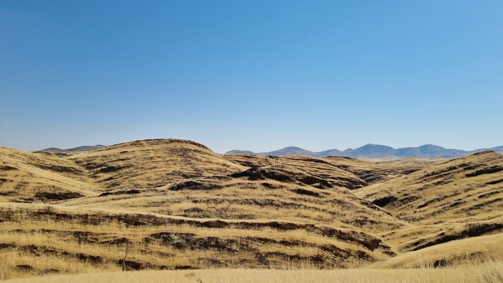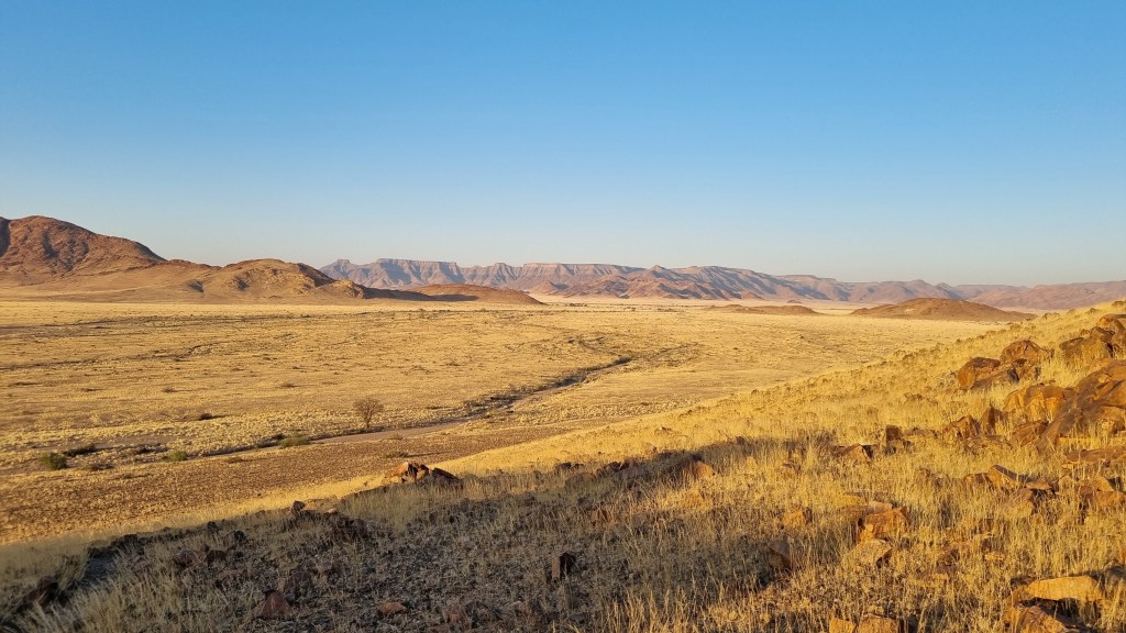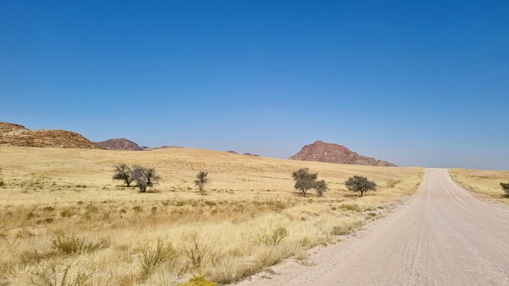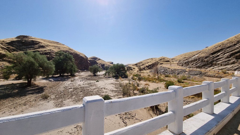 Après deux cents kilomètres de secousses, de tôles ondulées et de sable traître, condamnant le véhicule à glisser constamment, nous atteignons le canyon de Gaub. L’eau n’est plus présente actuellement, mais elle y a creusé son lit durant des millénaires au travers d’un massif rocheux découvrant aujourd’hui à ciel ouvert les strates colorées de roches sédimentaires de grès et de conglomérats, au milieu de vastes étendues d’herbes balayées par le vent. La route emprunte des virages, un pont qui traverse le lit de la rivière Gaub puis se relance quelques kilomètres plus loin dans un désert blanc.