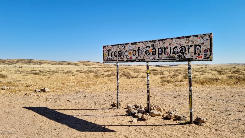 Nous coupons le tropique du capricorne peu de temps après, matérialisé par un grand panneau indicateur planté sur le bord de la piste et siglé d’autocollants du monde entier. Ces franchissements symboliques feront toujours la joie des voyageurs, nous laissant croire être, le temps d’une photographie, un aventurier plutôt qu’un touriste. Le symbole doublé, nous redevenons aussitôt des routiers roulant frénétiquement sur une piste ensablée rectiligne. Derrière nous, un haut panache de poussière blanche avale et fait disparaitre la route. Devant nous, l’horizon inaccessible. Ne reste plus que le bruit des cailloux tapant sous le véhicule et le roulis d’une conduite sur sable sous un soleil immobile.