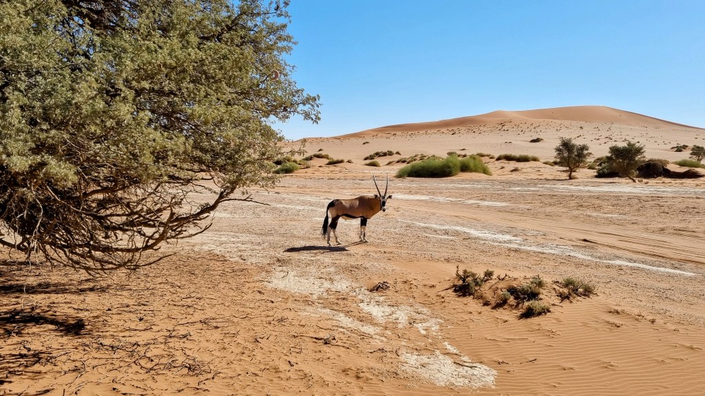 Sur ces étendues, le moindre mouvement attire aussitôt l’œil et on peut ainsi observer des petits groupes de springboks sur les prairies. De temps à autre un oryx solitaire à la robe fauve joliment dessinée, aux cornes pointant vers le ciel, nous dévisage placidement.
