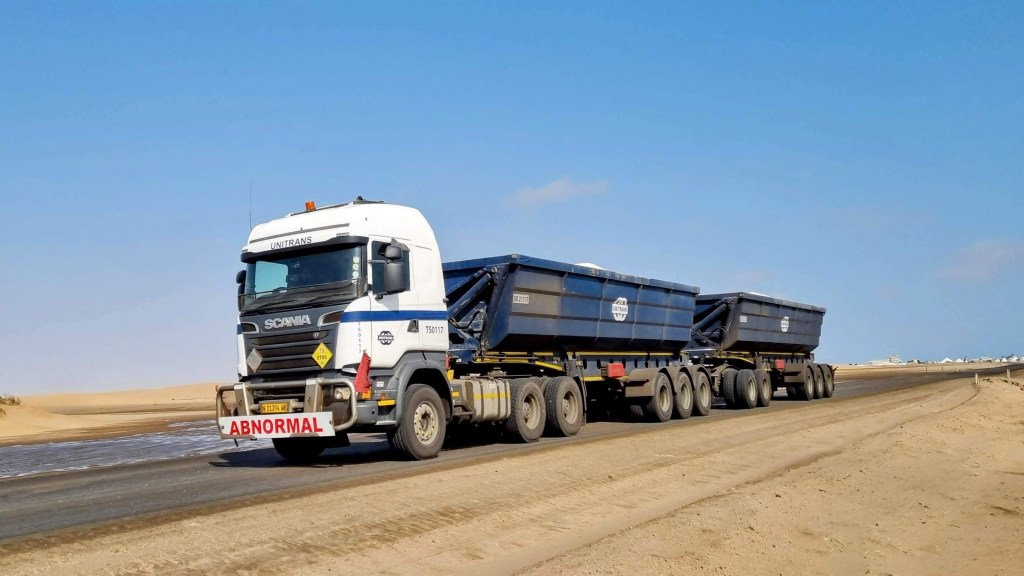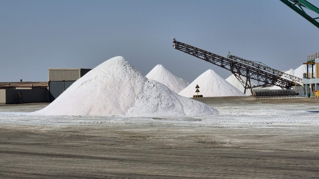 L’installation industrielle de la saline n’est pas à proprement parler, le site touristique le plus visité de la Namibie. Des dunes de sel aux discrets reflets rosés attendent d’être chargées pour le port de Walvis. Sur une piste damnée, des camions vont et viennent en nous frôlant. Des véhicules tout terrain s’inquiètent de nous voir marcher. On nous demande où on va, si tout va bien. C’est étonnant cette manie de certains automobilistes de considérer comme sorcellerie le fait d’utiliser la route avec seulement une paire de chaussures. Nous aurions envie de leurs poser la même question. Après tout, ce sont peut-être eux qui ont un problème avec leurs jambes.