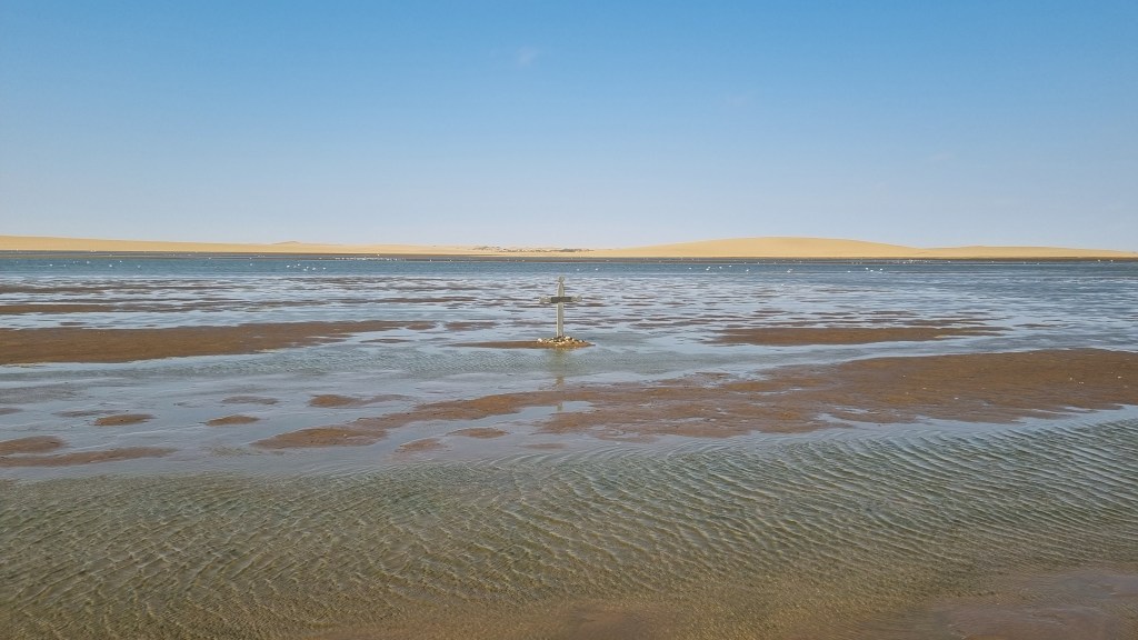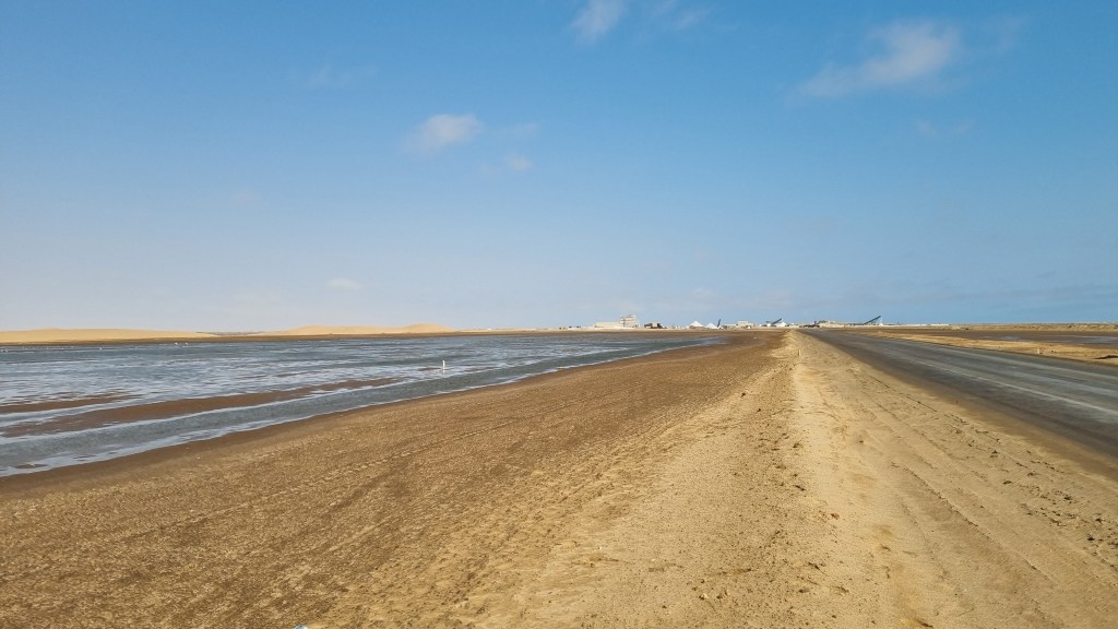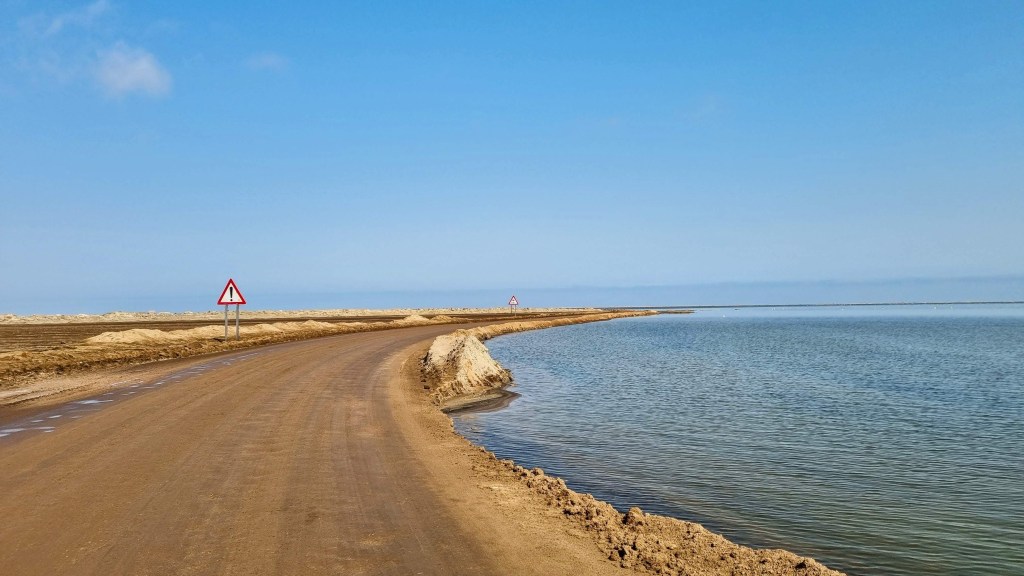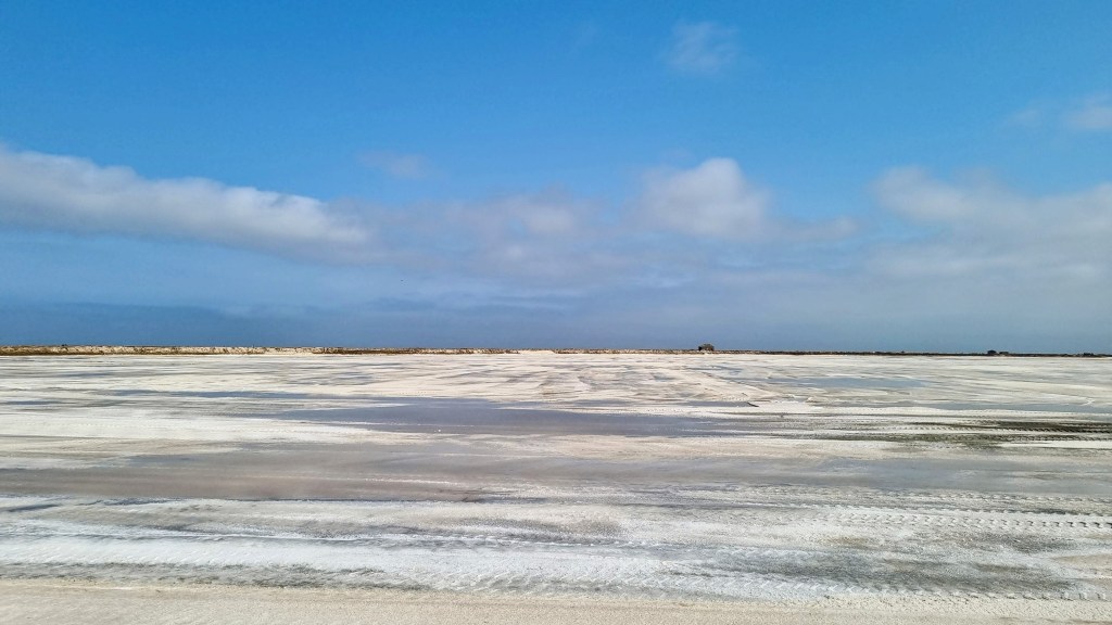 C’est une de celles-ci qu’on a prise ce matin. A la sortie de Walvis bay, il y a une piste qui se dirige vers des salines et une vaste lagune. Un peu plus loin, l’océan, qu’on espère pouvoir atteindre avant de devoir faire demi-tour.