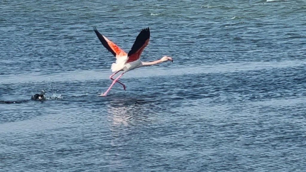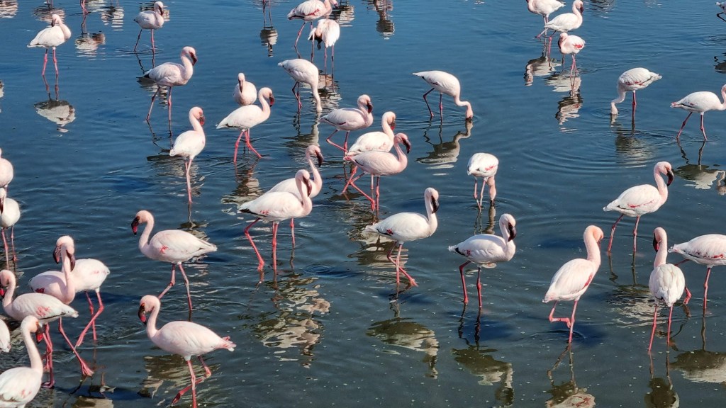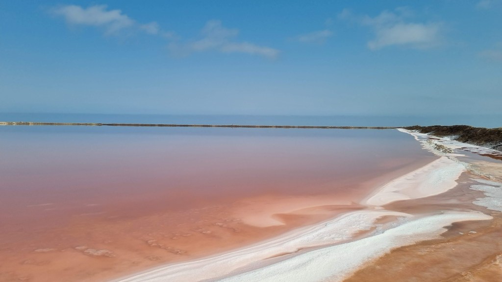 On marche au milieu de la mer entre une lagune peuplée de flamants roses montés sur échasses et des salines pink électriques. Des étendues blanches de sel viennent parfois distraire l’œil dans ce paysage monochrome. Les oiseaux sont si nombreux à certains endroits qu’ils paraissent en tapisser le sol intégralement. Ils fouillent sans cesse l’eau de leurs becs curieusement coudés et remuent frénétiquement le sable avec les pattes en donnant la charmante impression de danser quelques twists endiablés. Et quand ils se déplacent, la démarche lente, altière, le corps fleuri planté sur deux allumettes, c’est une leçon gracieuse qui est donnée à qui s’assied pour regarder.