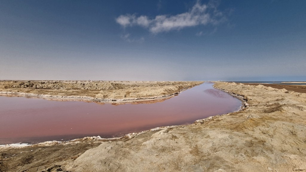 Au loin, des camions balaient le paysage, une montagne de sel blanc dans le dos, sur un fond de relief dunaire. Il y a quelque chose de triste et désolé dans le paysage, qui impose le silence. Et puis le ciel est gris, alors on se ressert une louche de mélancolie. Une escadrille de flamants, tendus comme la flèche de l’archer dans le ciel, survole la lagune à basse altitude. On baisse la tête pour laisser passer. On a beau marcher seul, à distance du reste du monde, c’est pourtant à cet instant que l’on éprouve le sentiment de se retrouver précisément au cœur du monde. A quelques mètres, des milliers de flamants dansent et défilent sur une plaine en eau.