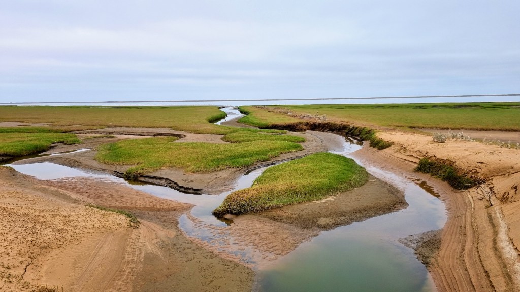 On continue, avec le sentiment d’être tombé dans le piège tant redouté de la ligne droite. Ça ne finira donc jamais. Le vent glace les oreilles et force à courber le dos. Nous aurions aimé atteindre la mer mais la distance semble la placer hors de notre portée aujourd’hui. On mange notre pain en compagnie des oiseaux et du vent qui ne laisse aucun répit.