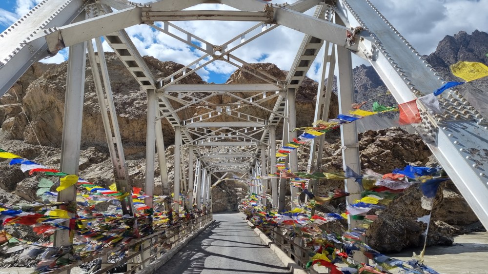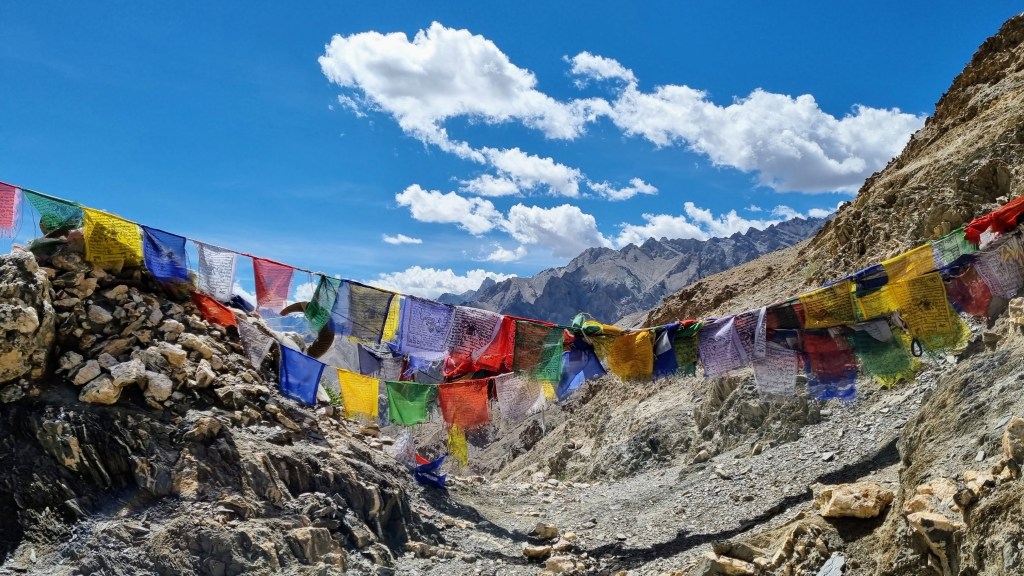 Nous étions arrivés la veille dans le village de Lamayuru, à la nuit tombée par un de ces bus qui parcourent quotidiennement la vallée de l’Indus. Désormais presque habitués au chaos des routes de montagnes, nous avions profité pleinement de ce lent voyage. Les corps connaissaient désormais toutes les subtilités de ces sentiers cabossés. Et nous trouvions alors normal de voir la fumée noire épaisse des échappements s’engouffrer par la fenêtre aux carreaux gras puis ressortir par la porte arrière du véhicule qui avait cessé définitivement de se fermer. Nous trouvions presque rassurant d’entendre le moteur hurler dans les côtes et les virages, le camion à la peine ne dépassant pas les vingt kilomètres heures. Nous restions malgré tout encore étonnés que le haut parleur grésillard du bus arrive presqu’à couvrir ces explosions de pétroles démoniaques en délivrant des chants pop ladakhis.