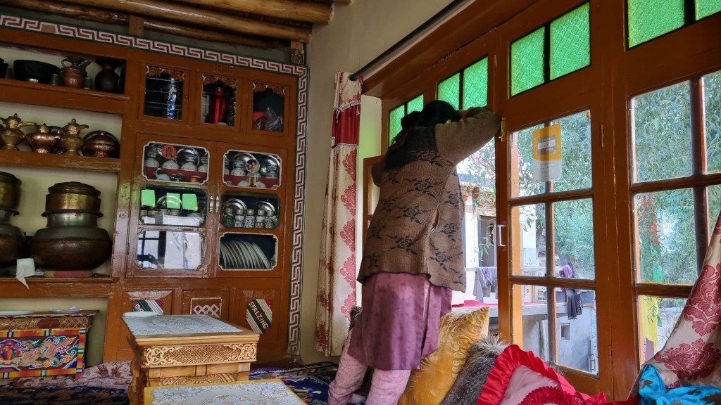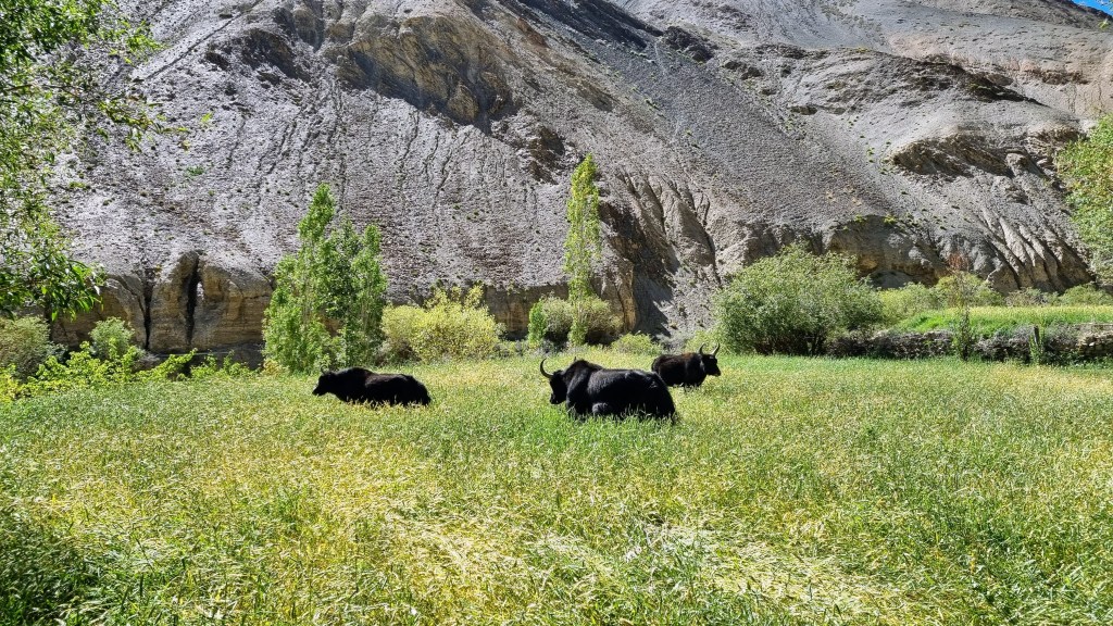 Allongés sur le sol, aux aurores, pratiquant quelques étirements matinaux, nous observons, la tête à l’envers, la crête des montagnes de l’Himalaya se profiler dans un ciel épinglé d’un soleil encore pale. On en distingue, à travers les petits carreaux de verres, les veines et rigoles sombres qui courent le long des pans massifs des roches caramel. Il fait doux et de la fenêtre ouverte, un vent timide agite les branches hautes des peupliers tandis qu’une vache meugle à un mètre de là. C’est toujours un étonnement de contempler le monde à l’envers, c’est un miracle inédit que de le regarder s’éveiller depuis les hauteurs du Ladakh.