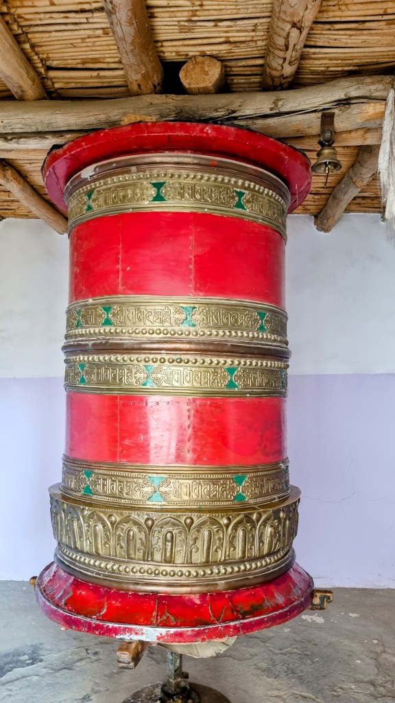 Lorsqu’on entre dans le temple du monastère du village, un des gompas les plus anciens du Ladakh, nous trouvons une grande salle où les tentures et les bannières colorées occupent les murs et descendent en guirlande du plafond. Aucun espace ne reste libre. Au centre, des estrades habillés de tapis, devant lesquelles sont disposées des tables basses, accueillent les moines lors des prières et des lectures sacrées. On longe les murs par la gauche. Des statues de bouddhas et de personnages saints s’y alignent, attendant silencieux, que les pélerins viennent les solliciter et laisser quelques offrandes. On y dépose des billets sur les rebords des statues, dans des coupelles déjà pleines ou faute de trouver une place, sur les genoux des vénérés saints. Dans une pièce adjacente, un moine récite la liturgie d’une voix grave, d’un ton monocorde étudié. Sa récitation sacrée est scandée au rythme d’un grand tambour suspendu vertical et est ponctuée par le tintement régulier d’une petite cloche rituelle, symbole féminin de la sagesse, tenue dans sa main gauche. La monotonie du phrasé destinée à créer un état de méditation chez le récitant et chez le pèlerin fait son office.