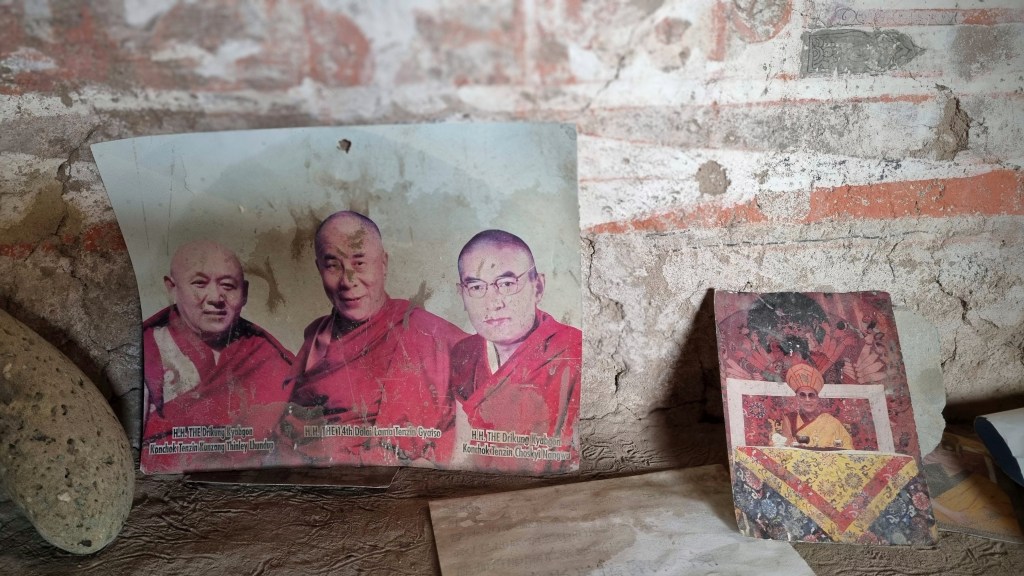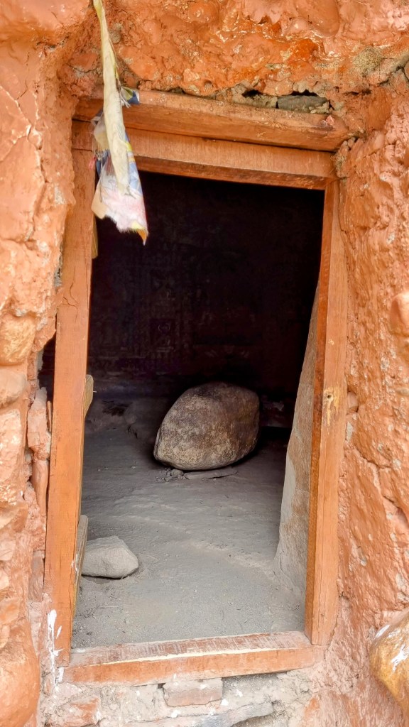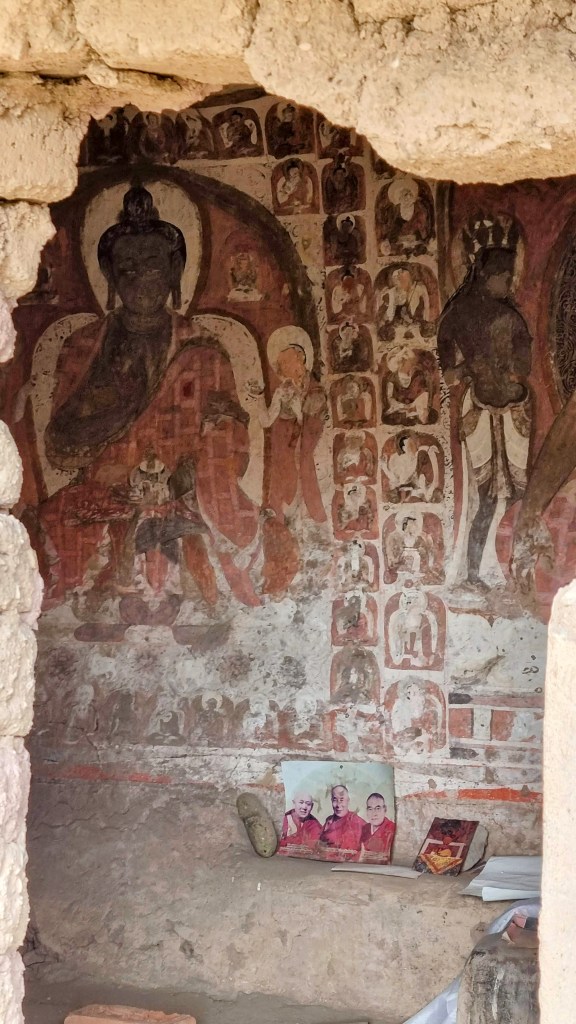 Par l’ouverture minuscule qui pouvait se fermer à l’aide de quelques planches pour l’hiver, on embrassait toute la vallée du regard. A l’intérieur, des signes de séjours y étaient visibles. Une photo jaunie du dalaï-lama, une lampe à huile, quelques poteries posées dans des excavations, la trace d’un feu, témoignaient du passage de pèlerins dans ces creux de falaise.