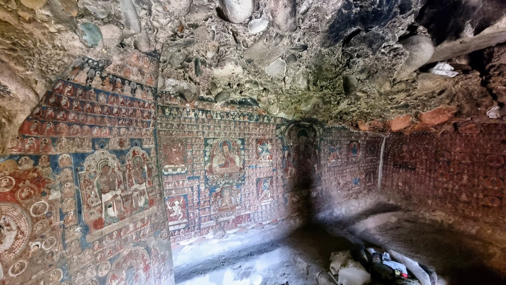 La réalité est tout autre quand nous les atteignons, après avoir ripé plus d’une fois dans la montée sur des colonies de maudits cailloux se dérobant sous les pieds. Les grottes cachent dans la noirceur de leurs antres un trésor presque oublié du reste du monde. Sur les murs, des fresques aux teintes passées, pour la plupart toujours très nettes, exécutées probablement à partir du onzième siècle, s’offrent à nos yeux piqués de sueurs.