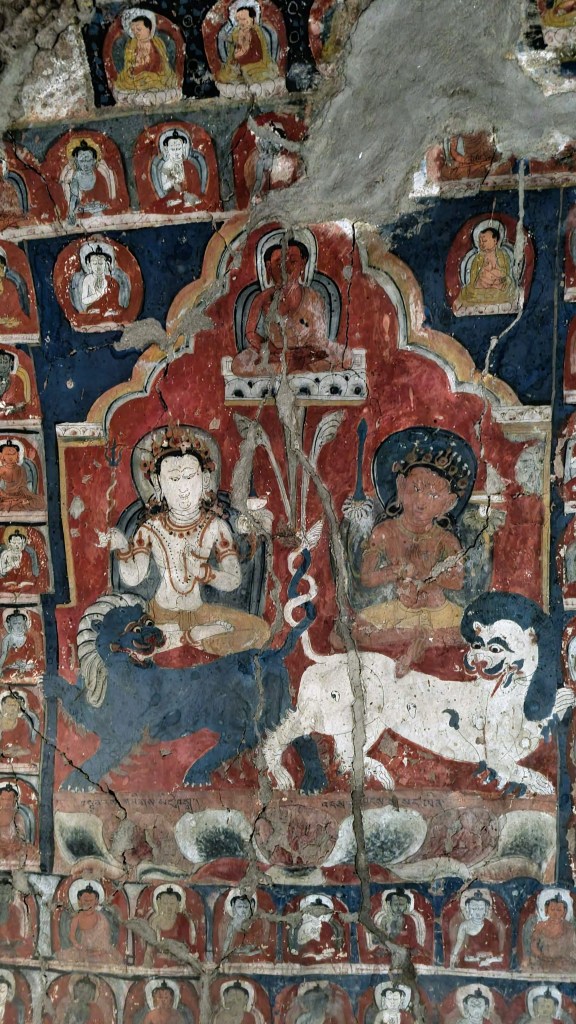 Les peintures murales, évoquant les symboles ésotériques du bouddhisme tibétain, étaient alors des supports visuels destinés à aider les méditants. On y retrouvera des similitudes évidentes avec celles du monastère d’Alchi, de l’autre côté de la vallée, mais le caractère difficilement accessible et abandonné de ces œuvres picturales en donneront une valeur bien différente à nos yeux. Nous étions si habitués à voir préserver la moindre trace de notre passé sous les plaques de verre, dans les musées réfrigérés, derrière les cordons de sécurité, qu’il nous paraissait, à ce moment précis, totalement inconcevable de savoir abandonné un patrimoine d’une beauté si touchante. Nous resterons longtemps dans l’obscurité de la grotte principale, admirant ces dessins malgré la précarité évidente de la voûte de la caverne. L’instabilité de la structure du conglomérat mou nous pressait de sortir mais nous restions. Nous apprendrons que les grottes s’écroulaient les unes après les autres.