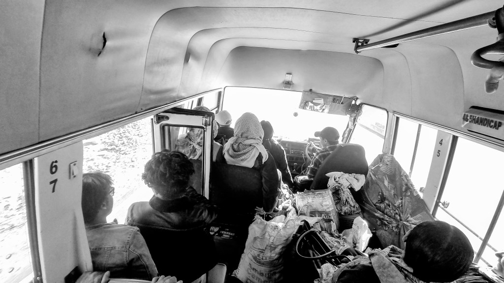 La route nous emportait de nouveau ! On arrête un bus à la volée, le stoppant net en pleine course, à la sortie d’un virage. Il est rempli et nous nous retrouvons dans la travée en position latérale par rapport à la route. Nos sacs viennent d’être balancés sur la galerie du toit. La question n’est plus de savoir si on les retrouvera en arrivant, on ne les voit plus. En attendant, on fléchit légèrement les genoux, le corps souple, le regard porté loin devant en direction du pare-brise fissuré, on conserve l’équilibre avec les bras et puis…on surfe !