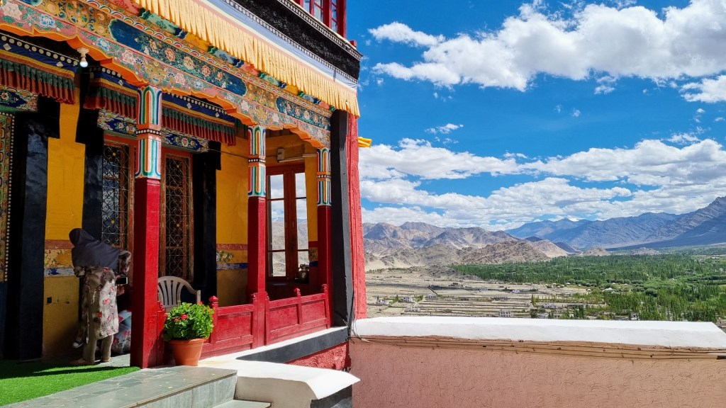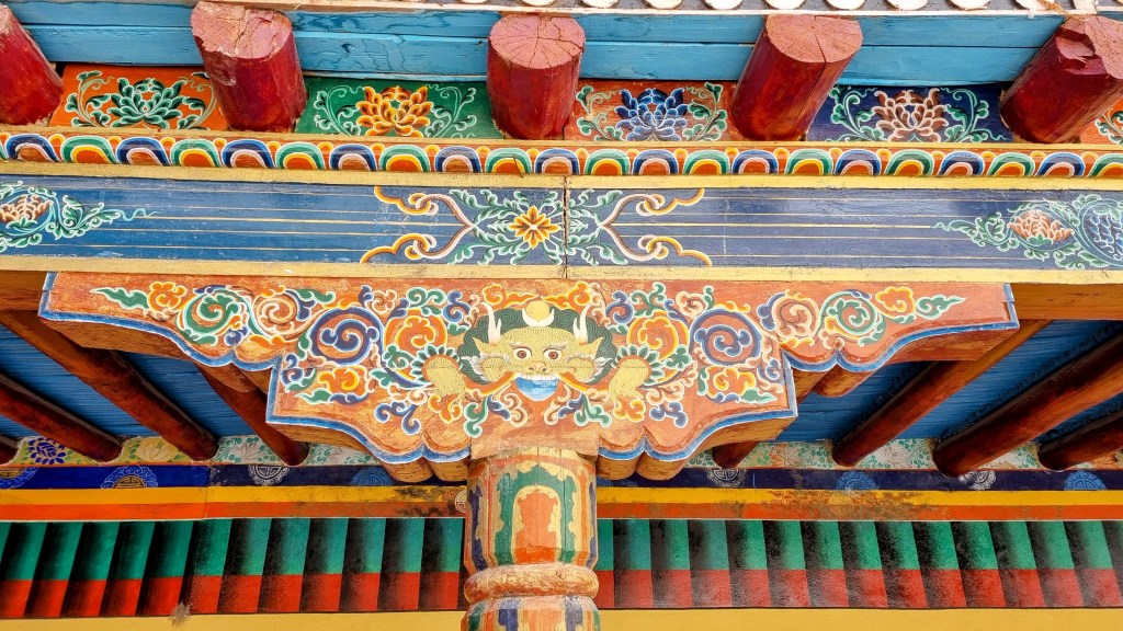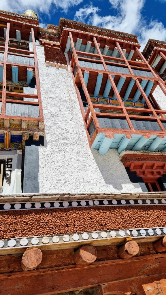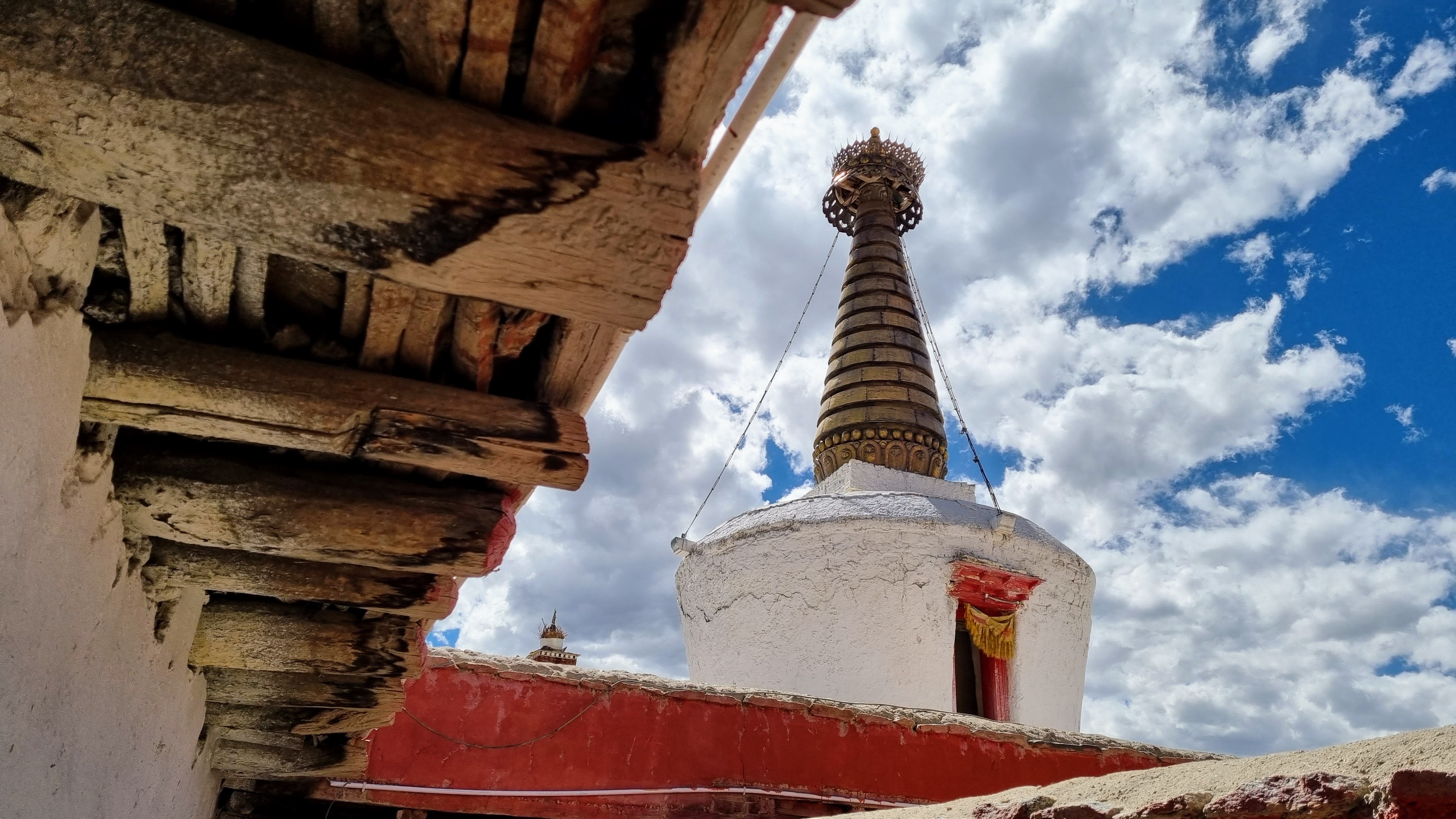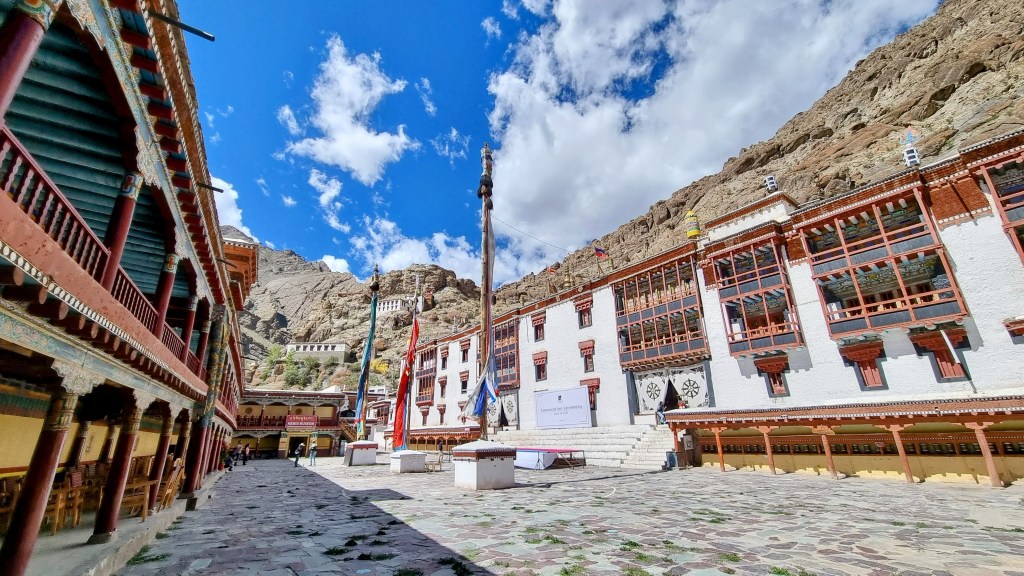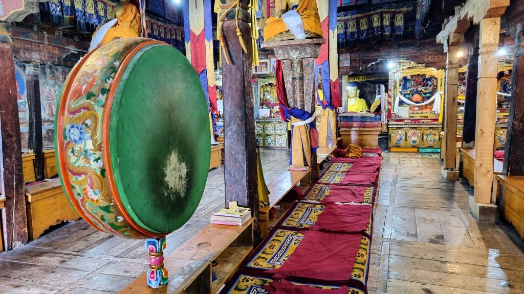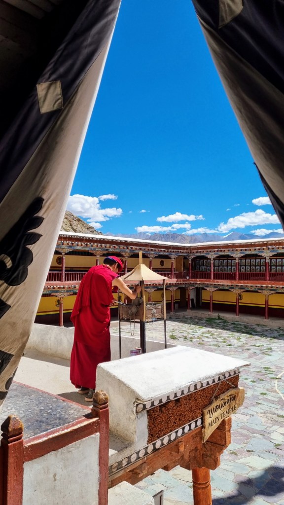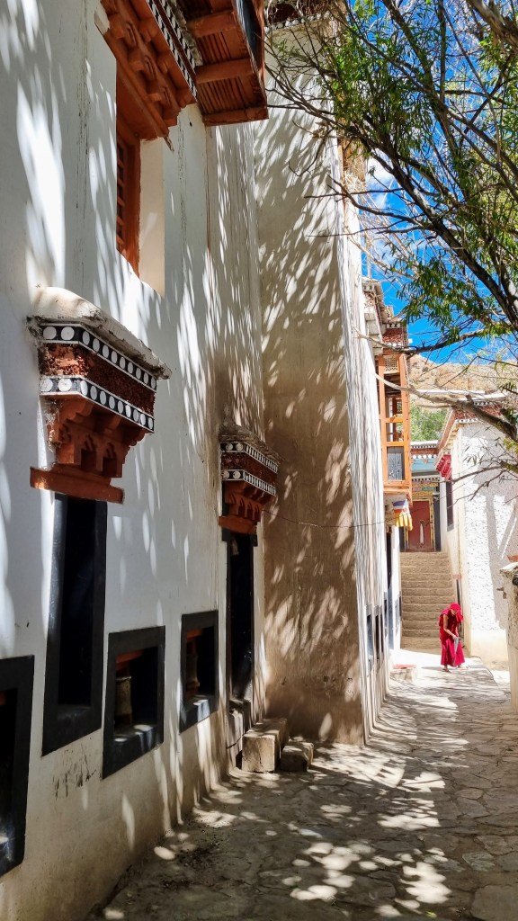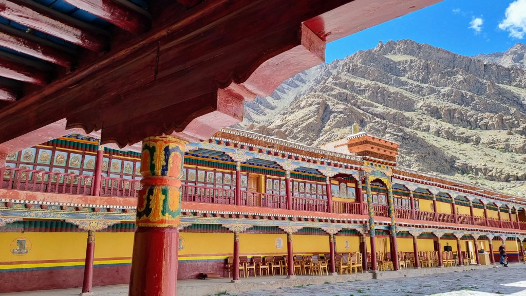 Alors on se promène en couleur et en hauteur. Hemis, le plus grand de tous au Ladakh, s’éloigne du regard de l’Indus en se cachant dans les dénivelés d’une faille montagneuse. Sa cour centrale emporte tous les suffrages à l’applaudimètre, tant elle est vaste et somptueuse. D’un côté le palais massif, éblouissant lorsque le soleil se jette sur ses murs chaulés, aux nombreuses fenêtres étroites, par lequel on accède aux deux temples principaux du site. En face, un bâtiment aux murs aveugles, parés de teintes ocres jaunes et vermeils, surélevé d’un étage où coure tout le long un balcon de bois, ferme l’esplanade. Les montagnes austères enserrent ce joyau et le mette à l’abri du reste du monde.