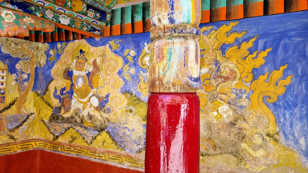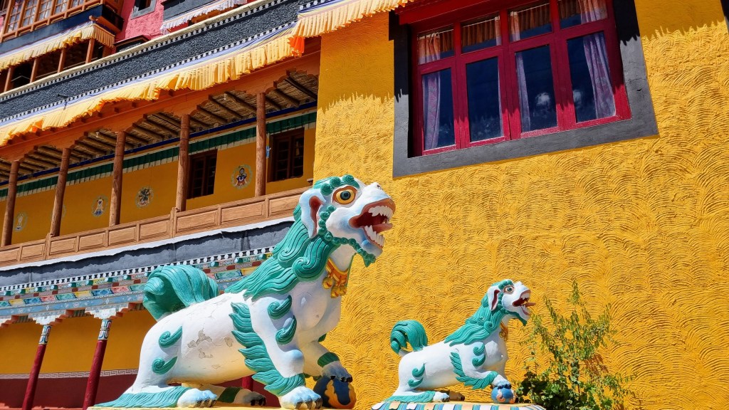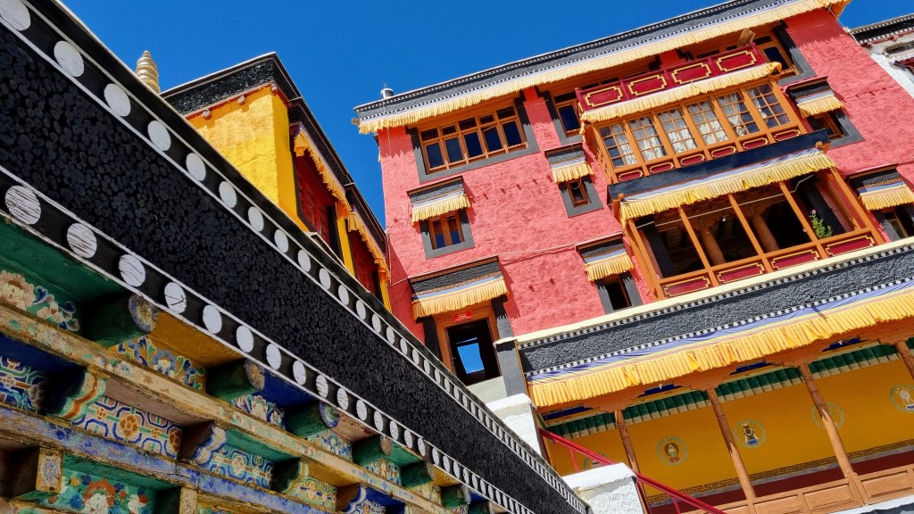 Il y a dans les monastères d’Hemis et de Thiksey, comme un apport de lumière en sus, en comparaison des plus austères et vénérables gompas de Lamayuru et d’Alchi. Ces impressionnants lieux sacrés du bouddhisme tibétain sont aussi plus récents, bâtis ou rénovés entre le quinzième et le dix-septième siècle, et semblent apporter, notamment par les éclairages et les couleurs, un vent de modernité. Sans vouloir comparer ce bouleversement avec celui, européen, de l’art brut roman à la folie artistique gothique, on sent comme un souffle de changement parcourir la vallée de l’Indus.