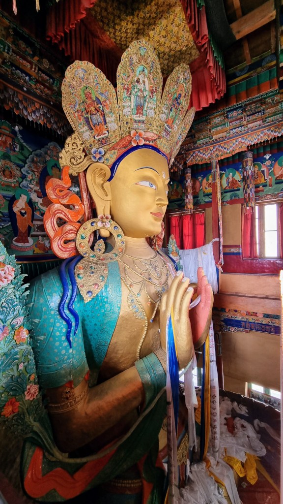 Et puis dans la vallée, planté sur un caillou à la vue de tous, Thiksey, village agrippé aux pentes d’un rocher et couvert en son sommet d’un gompas d’or et de sang. Toute l’histoire du petit Tibet affichée et racontée en un seul regard ! A l’intérieur, c’est une déferlante de couleurs chatoyantes. On passe d’un temple à un autre par une succession d’escaliers et de paliers, offrant à chaque fois un point de vue inédit sur le gompa et la vallée. Un bouddha géant de quinze mètres construit en 1970 en l’honneur du Dalaï-lama achève de conquérir le cœur des pèlerins et des visiteurs, venus en nombre pour le vénérer. Un petit groupe de jeunes ladakhis, visiblement excités à l’idée d’être présents dans ce haut lieu de spiritualité, tourne autour de la statue, tantôt silencieux, marmonnant des prières, tantôt exubérants, commentant, haut et fort, le moindre détail de l’œuvre, à l’aide de grands gestes enthousiastes. Nous faisons provisions de joie et de couleurs, assis dans la pièce, à les observer distraitement tout en continuant à laisser le regard porter sur la vallée de l’Indus et la chaîne de montagne de Stok Kangri.