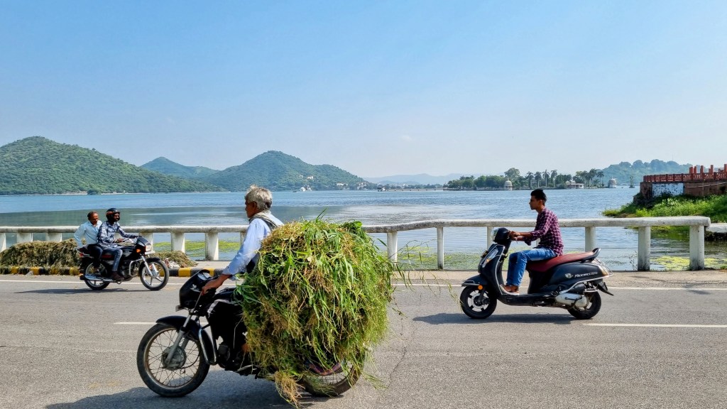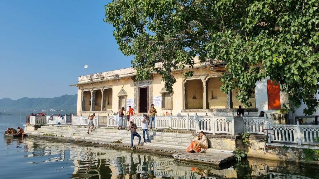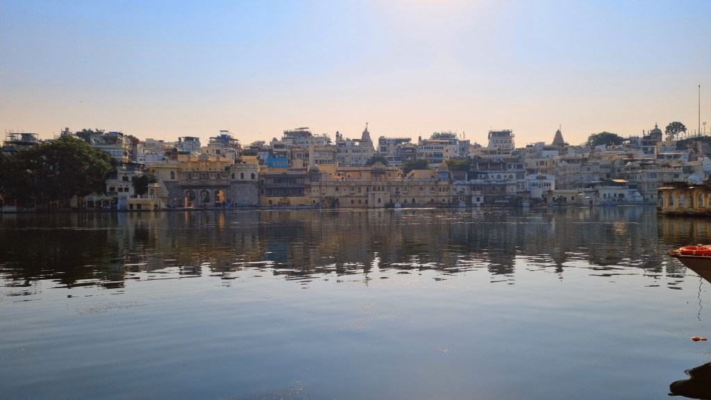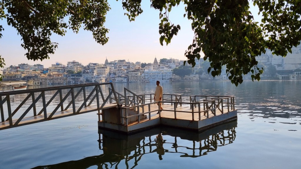 Udaipur, ville d’eau des maharadjahs au Rajasthan, promettait le prospectus que l’on n’a jamais lu. Il n’aurait pas menti, si on l’avait reçu dans notre boîte aux lettres. C’est seulement qu’on a plus de boîte aux lettres. Trois lacs se succèdent autour desquels s’est bâtie la ville. L’ambiance contraste singulièrement avec les autres cités de la région. L’eau semble y avoir apaiser les esprits surchauffés et abaisser les décibels autorisés des klaxons assassins, même si ceci n’est pas tout à fait exact en périphérie ; le bruit n’est pas une discipline optionnelle en Inde. Mais autour des lacs de Udaipur, il semble que le Rajasthan se soit adoucit. On y marche aussi peut-être un peu plus qu’on ne roule et la proximité de l’eau offre un dégagement visuel nouveau et appréciable. Quelque chose a changé et c’est perceptible dès la descente du bus.
